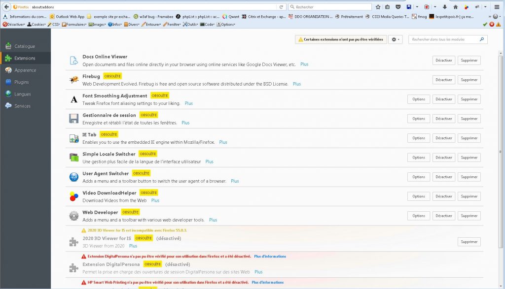 J’ai commencé à prendre peur en regardant la page des extensions, tous ces petits programmes qui font que Firefox fonctionne au delà de sa sphère de base et qui font que c’est devenu mon outil de travail numéro 1. Bref, toutes ces extensions comportent depuis peu un encart jaune “obsolète“: