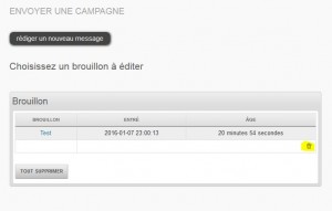 Le plus dur est fait. Maintenant 2 solutions, soit aller dans les brouillons, soit retourner dans le menu “Campagnes” et cette fois choisir la sous rubrique “Envoyer une campagne”. Dans les 2 cas, il y a une nouvelle icône à côté de la campagne, une icône poubelle! Ouf ! |