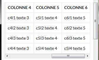 <tr> <td data-title="Colonne 1">Ligne 1</td> <td data-title="Colonne 2">c2l1 texte 1</td> <td data-title="Colonne 3">c3l1 texte 2</td> <td data-title="Colonne 4">c4l1 texte 3</td> <td data-title="Colonne 5">c5l1 texte 3</td> <td data-title="Colonne 6">c6l1 texte 3</td> </tr>