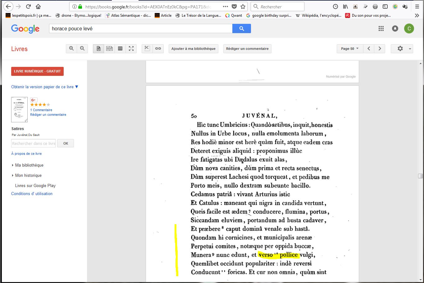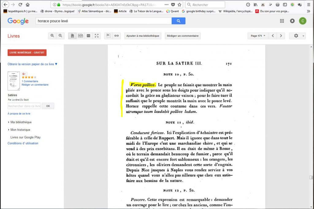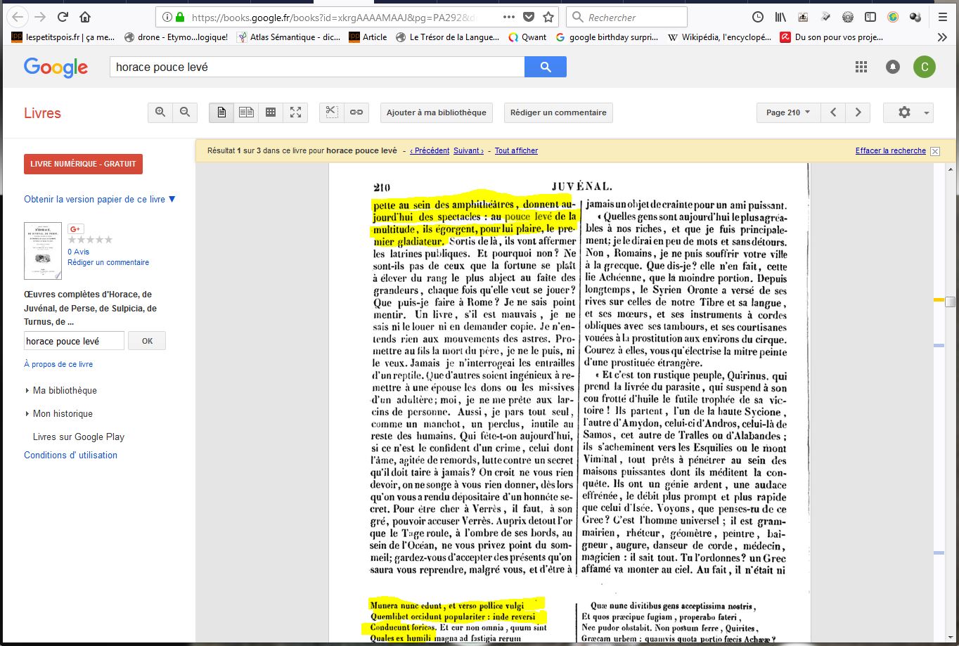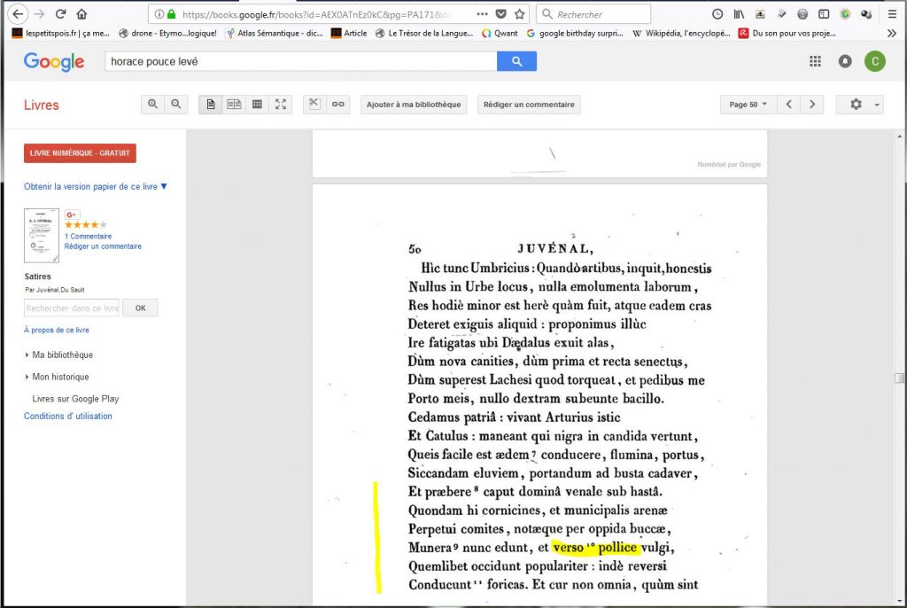 Je veux dire verso pollice ça veut littéralement dire “pouce tourné”, et nulle part j’ai pu lire chez les auteurs latin une indication de direction (tourné vers où ?).