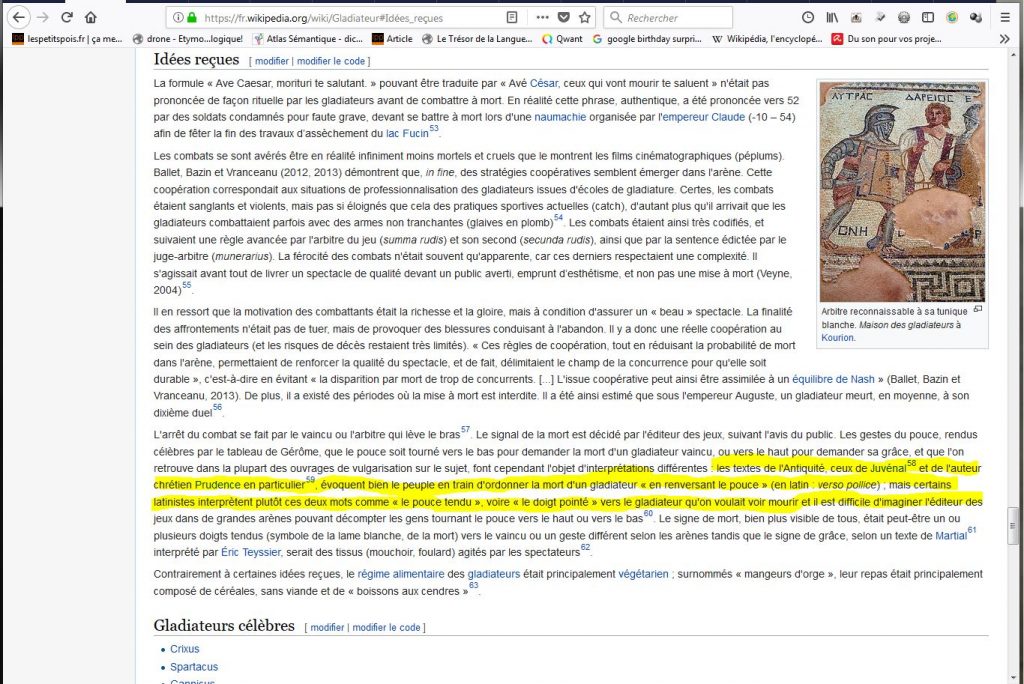 Mais nulle part, ni chez Juvénal, ni chez Horace (note1) , ni chez Prudence (note 2), il est expliqué vers quoi était retourné ce pouce (terre ou spectateur).