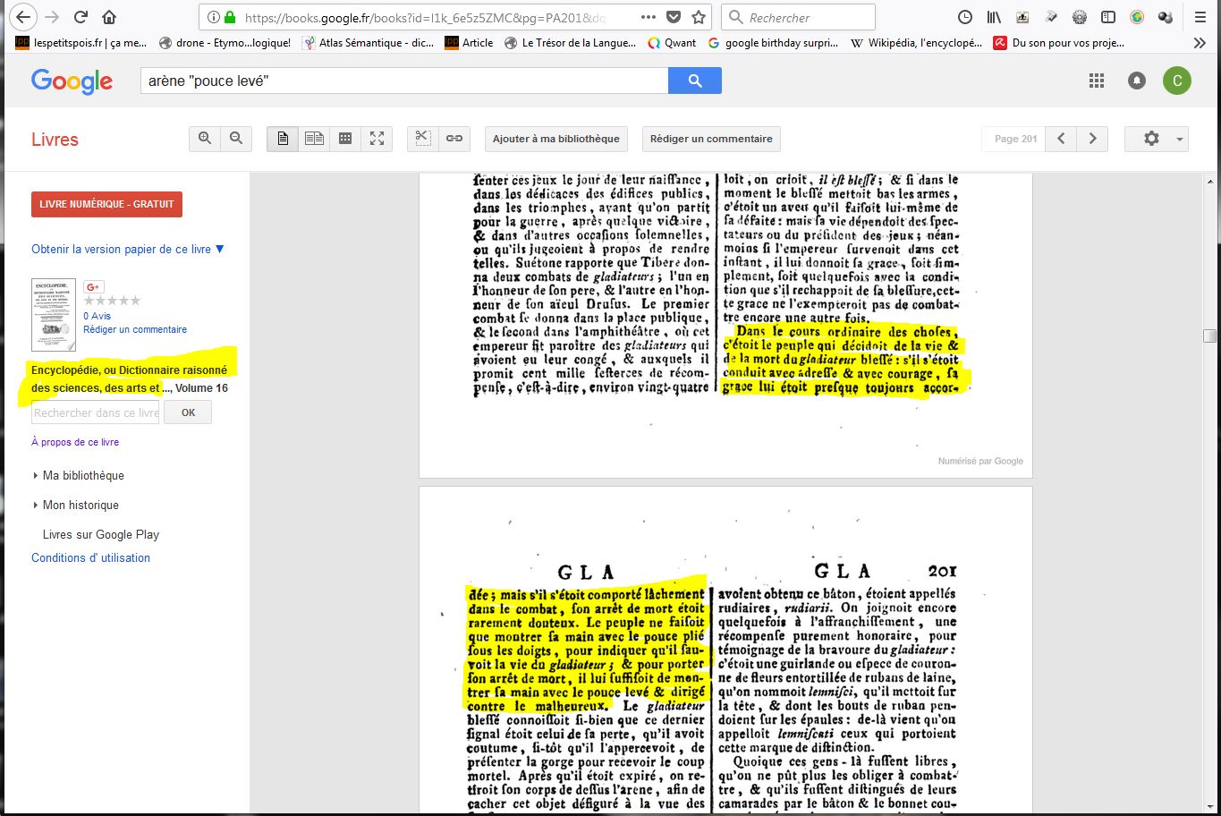 Peut-être de l’Encyclopédie, ou Dictionnaire raisonné des sciences, des arts et des métiers, par une Société des gens de lettres. Mis en ordre & publié par M. Diderot; & quant a la partie mathématique, par M. D’Alembert. Volume 16 – 177X. Dans lequel on trouve un article très conséquent sur les gladiateurs et évidemment un passage qui nous concerne: