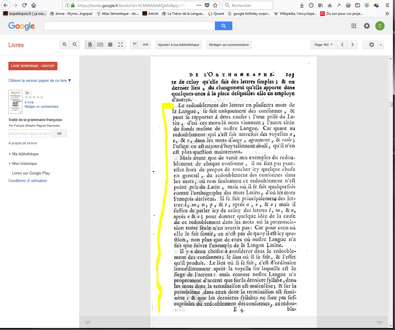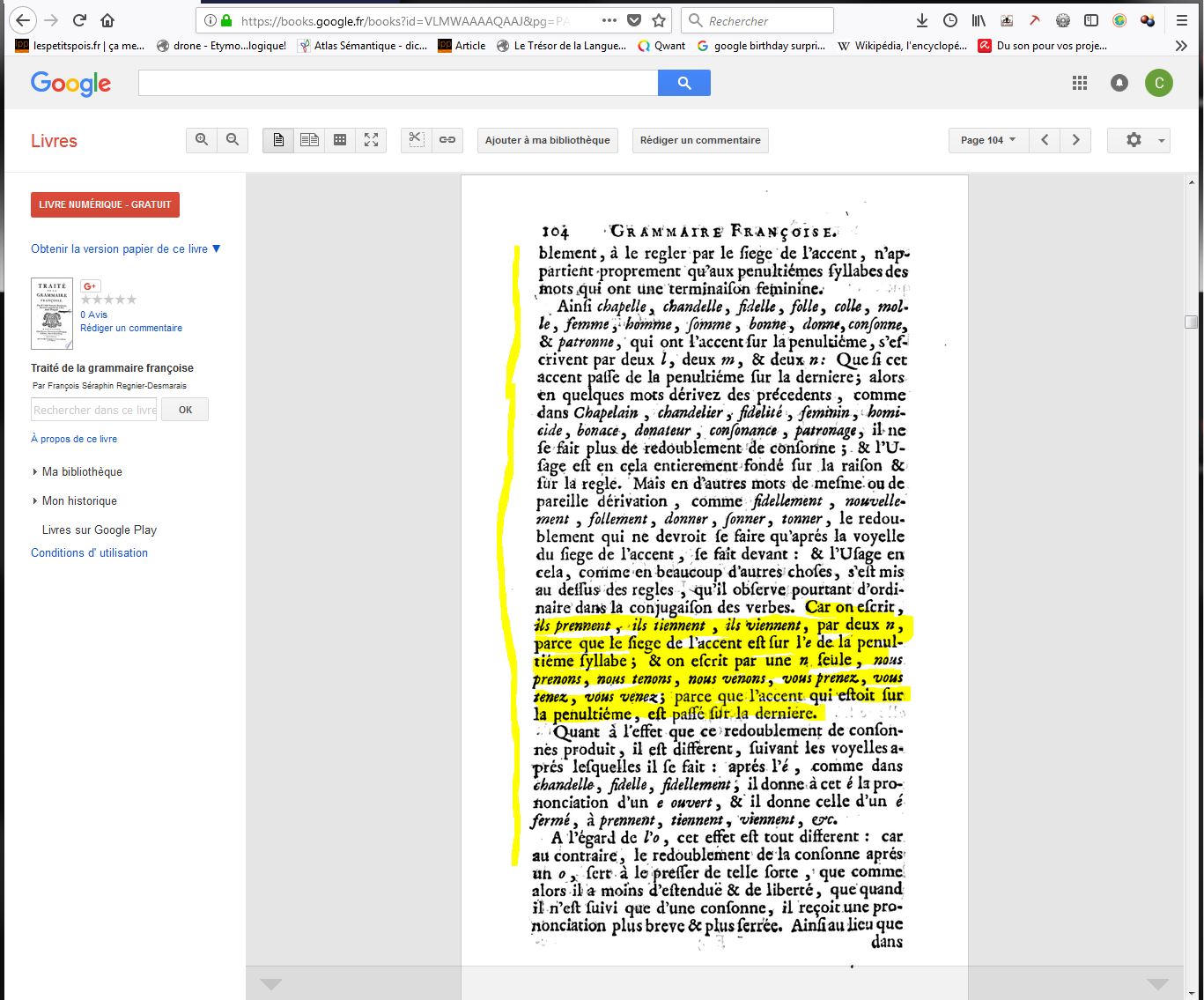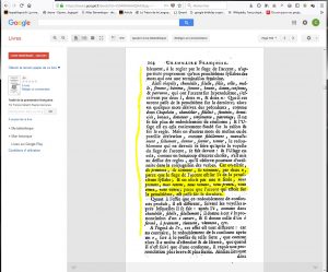 Ce que je sais en revanche c’est que le livre scanné est disponible dans son ensemble gratuitement et qu’il promet de répondre à de multiples questions concernant le parcours de la Langue française. Je le garde au chaud. J’aime l’idée que le passé réponde aux questions du présent… Qui sait ce que l’avenir nous réserve ?