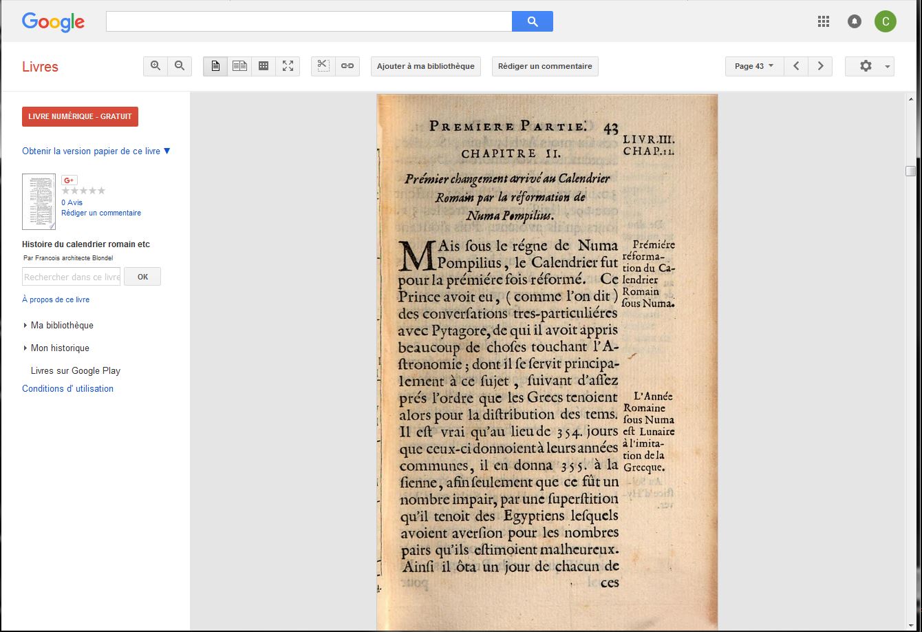Mais sous le règne de Numa Pompilius, le Calendrier fut pour la première fois réformé. Ce Prince avait eu, (comme l’on dit) des conversations très particulières avec Pytagore, de qui il avait appris beaucoup de choses touchant l’Astronomie; dont il se servit principalement à ce sujet, suivant d’assez prés l’ordre que les Grecs tenaient alors pour la distribution des temps.