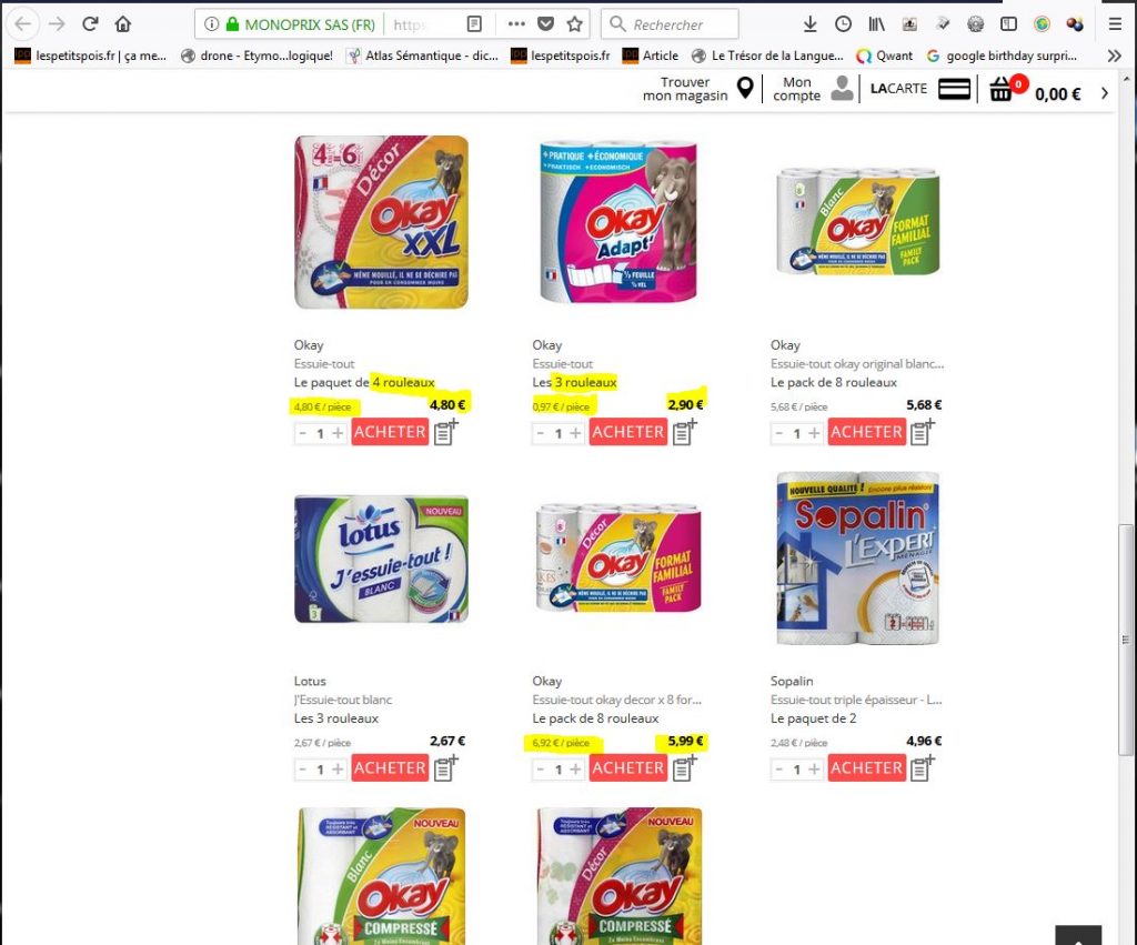Et finalement, à la réflexion, on aurait aimé retrouver cette précision sur le papier essuie tout parce que, comparer des paquets de de 4 rouleaux  avec des paquets de 6 rouleaux  ou même des rouleaux entre eux, sachant qu’ils n’ont jamais le même nombre de feuilles, c’est totalement impossible. Le prix du papier essuie tout défi toutes les lois rationnelles. Il est purement lié au marketing. Je pense.