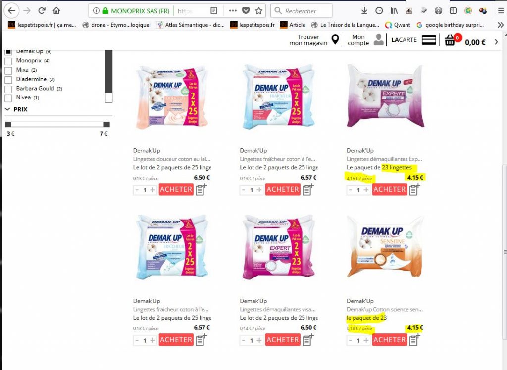 Ainsi, pour en revenir aux screenshots,  si le produit c’est un paquet de lingettes, la pièce c’est ce paquet dans son ensemble et devrait donc être affiché uniquement le prix du paquet dans son ensemble; cependant, il faut avouer que sur ce genre de produit, avoir le prix à la lingette est extrêmement intéressant et beaucoup plus précieux pour la comparaison.
