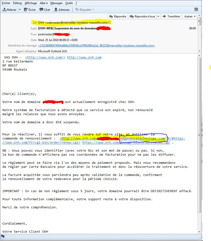 Un podium pour ce mail de type phishing: il n’en manque pas beaucoup pour passer pour vrai: 2 URL qui ne pointent pas vers OVH (en jaune):