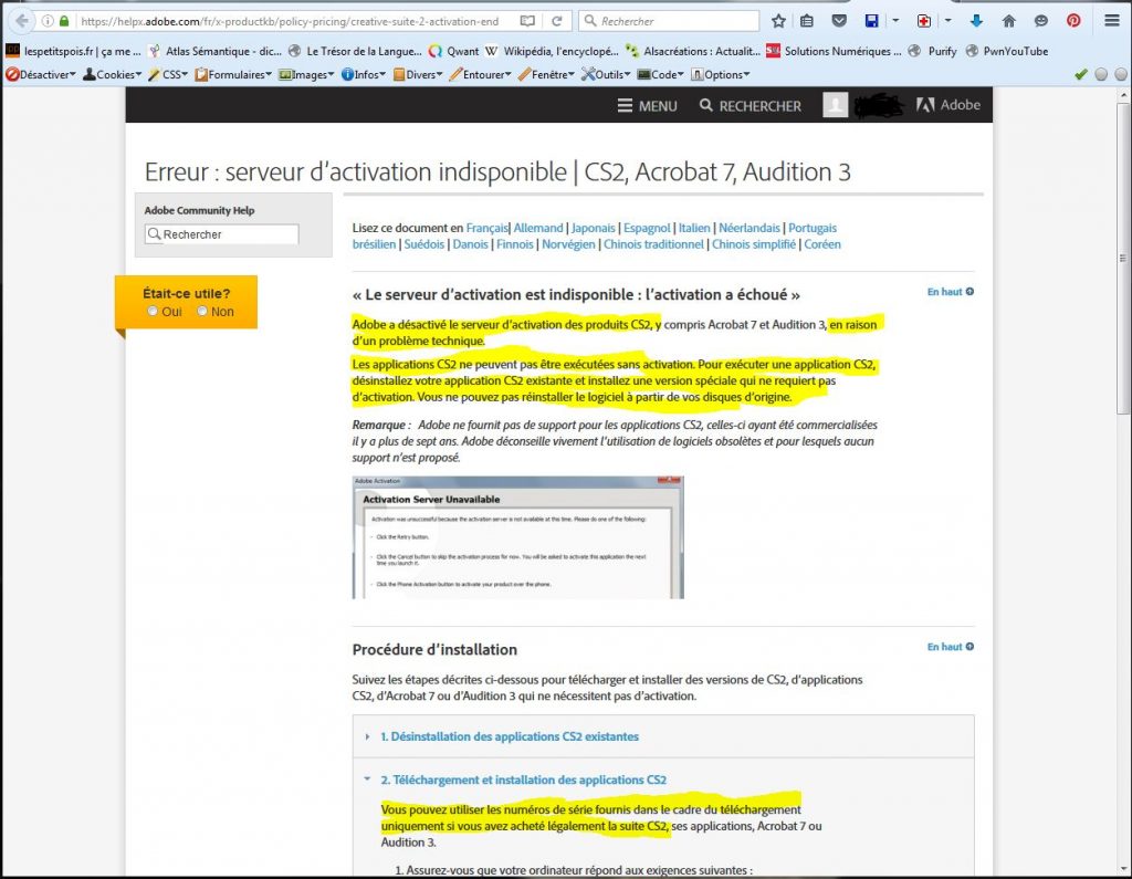 En Janvier 2013, Adobe annonçait la désactivation du serveur d’activation des produits CS2 tout en mettant à la disposition de tous les utilisateurs du site adobe.com l’entière suite de logiciel, n° de série compris.