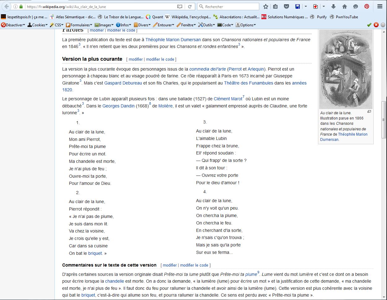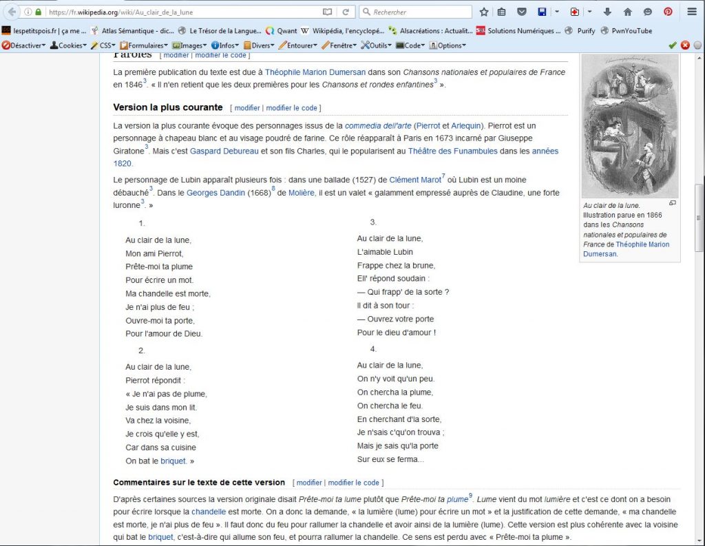 Voici l’histoire: poussée par la curiosité et toujours à la recherche de la “vérité”, il se trouve que je suis en train de lire l’article sur le Wikipédia concernant “Au clair de la lune”.