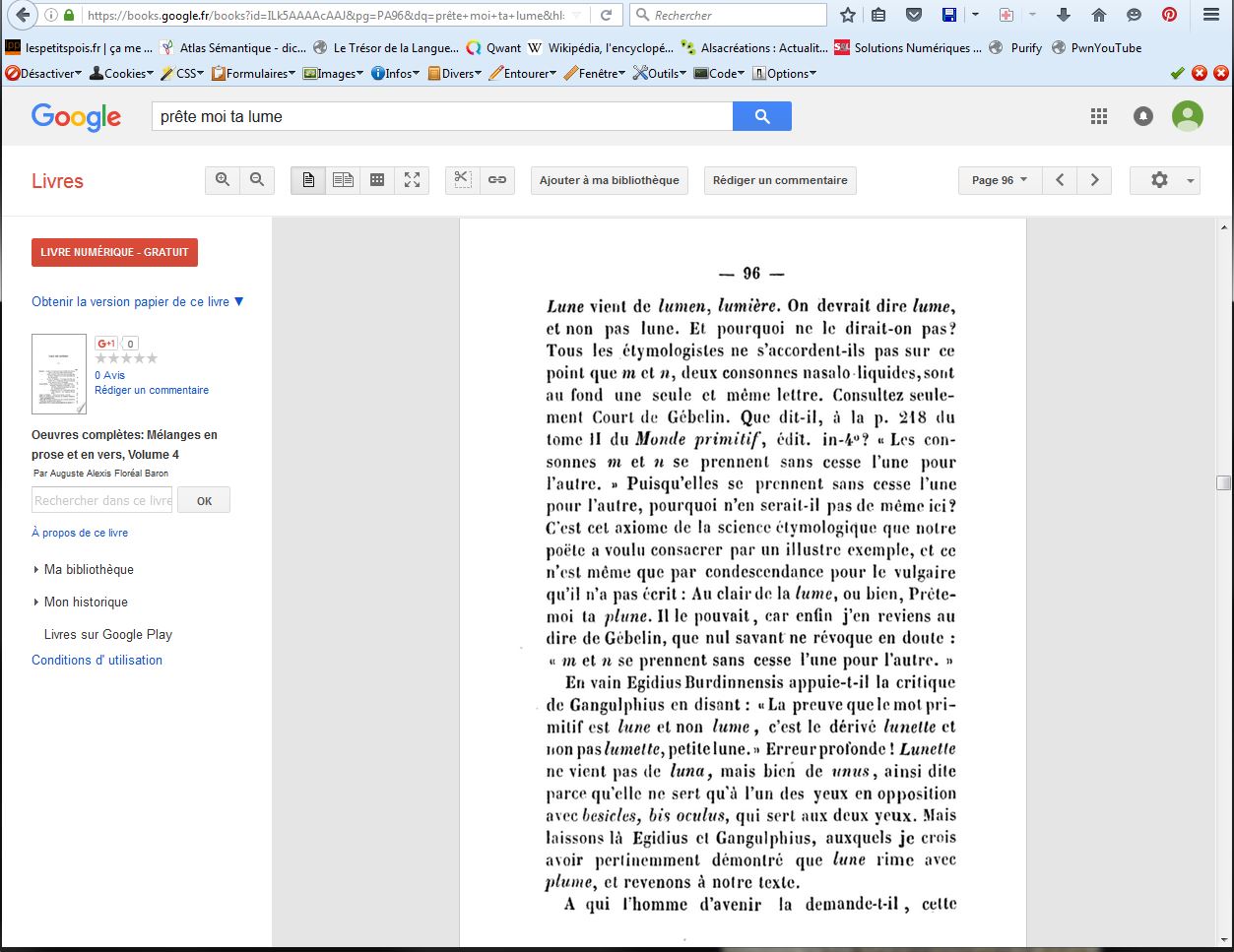 En vain Egidius Burdinnensis appuie-t-il la critique de Gangulphius en disant: “La preuve que le mot primitif est lune et non lume, c’est le dérivé de lunette et non pas lumette, petite lune.” Erreur profonde ! Lunette ne vient pas de luna, mais bien de unus, ainsi dite parce qu’elle ne sert qu’à l’un des yeux en opposition avec besicles, bis oculis, qui sert aux deux yeux. Mais laissons là Egidus et Gangulphius, auxquels je crois avoir pertinemment démontré que lune rime avec plume, et revenons à notre texte.”