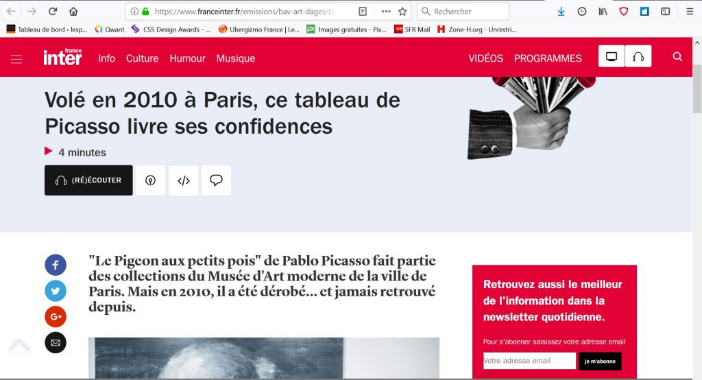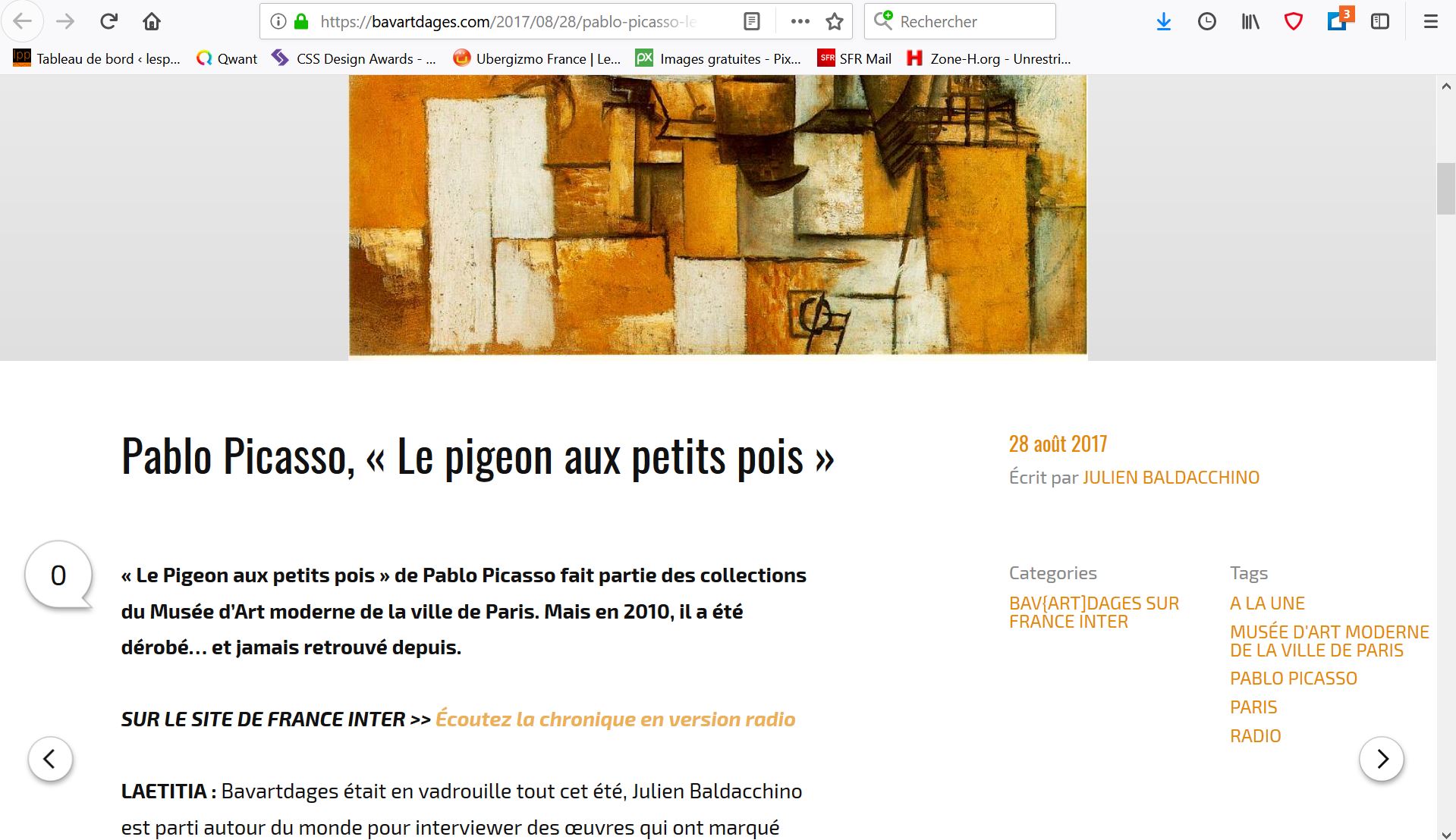 Aujourd’hui, c’est France Inter qui vient à la rescousse des petits pois avec une petite mise en scène sur l’histoire du “Pigeon aux petits pois” de Pablo Picasso (en français dans le texte):
