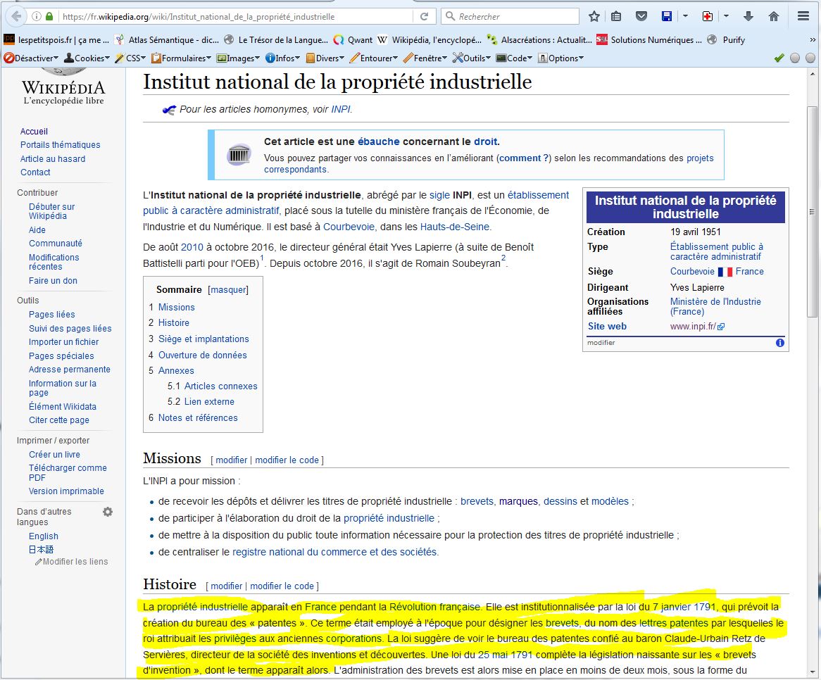 D’ailleurs, à la Révolution Française, le tout premier établissement créé pour s’occuper de ces “brevets”, va s’appeler le “bureau des patentes”.