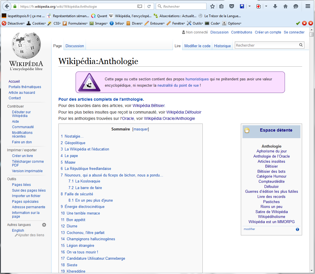 Détours & des tours, Humeur Comment se détendre avec Wikipédia 20 février 2016 sonsrouges Laisser un commentaire Aller à l'espace détente du Wikipédia en suivant ce lien: lien. Choisissez une rubrique du menu situé à droite: Laissez-vous envahir Je recommande: 500 grammes d' "Articles insolites" Une cuillère à soupe de "Guerres des éditions les plus futiles" Un zeste d'Anthologie