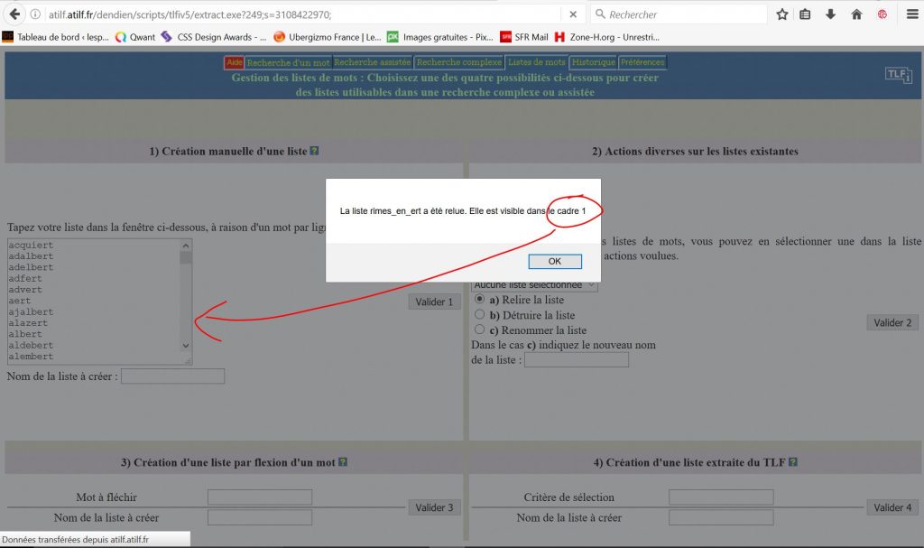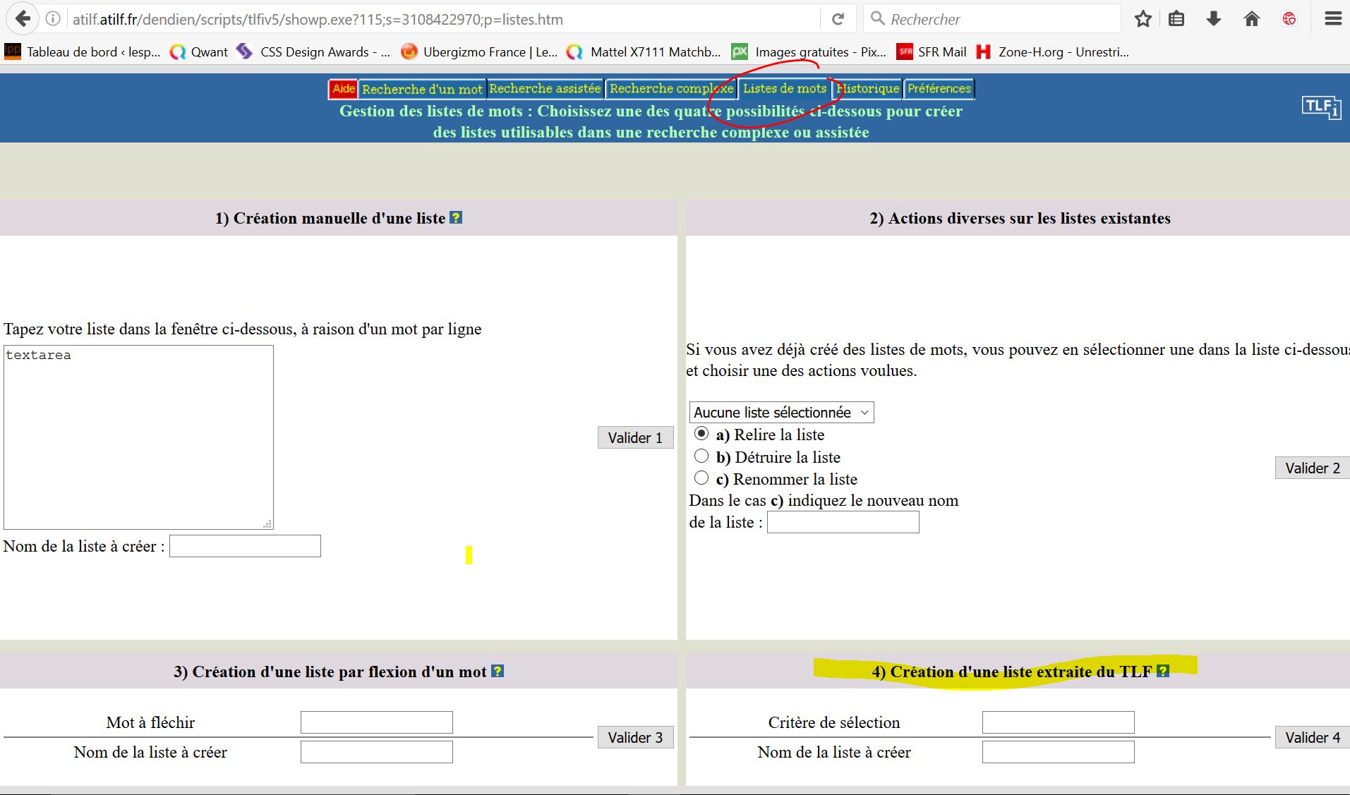 - et des fonctionnalités permettant de créer des listes de mots; ma préférée étant la “Création d’une liste extraite du TLFI”: