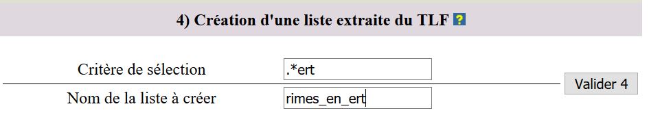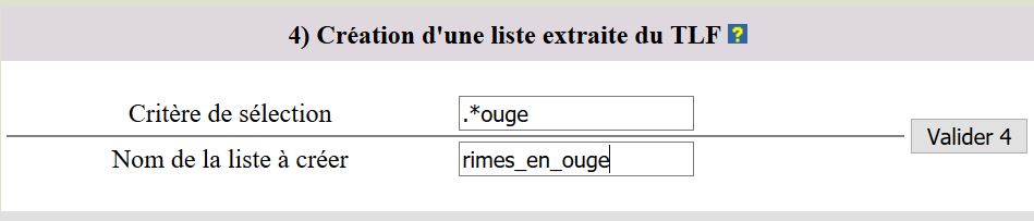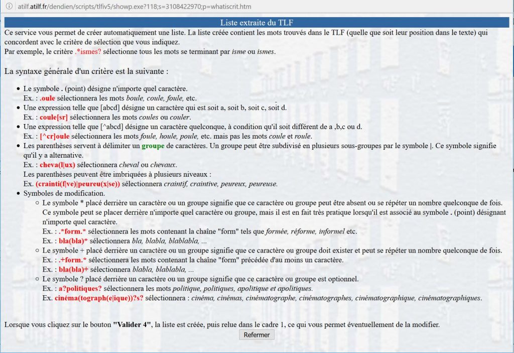 Cette fonctionnalité permet de créer une liste de mot (faisant partie du tlfi) répondant à des critères précis du type “commençant par” ou “finissant par”.