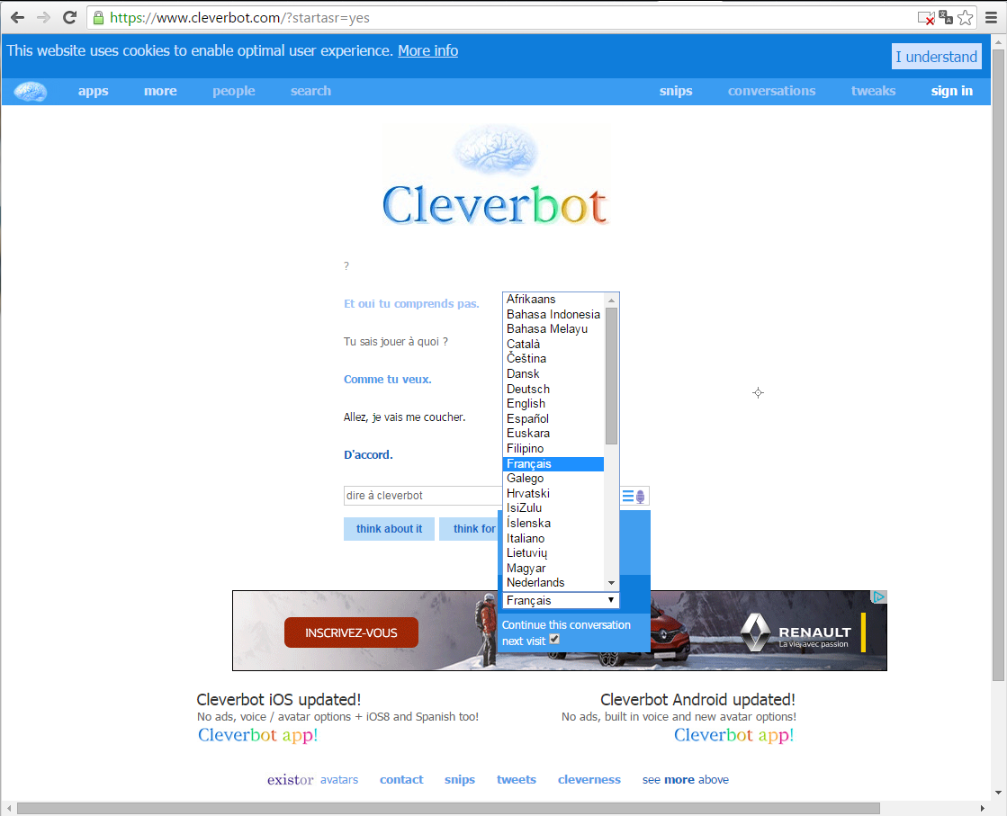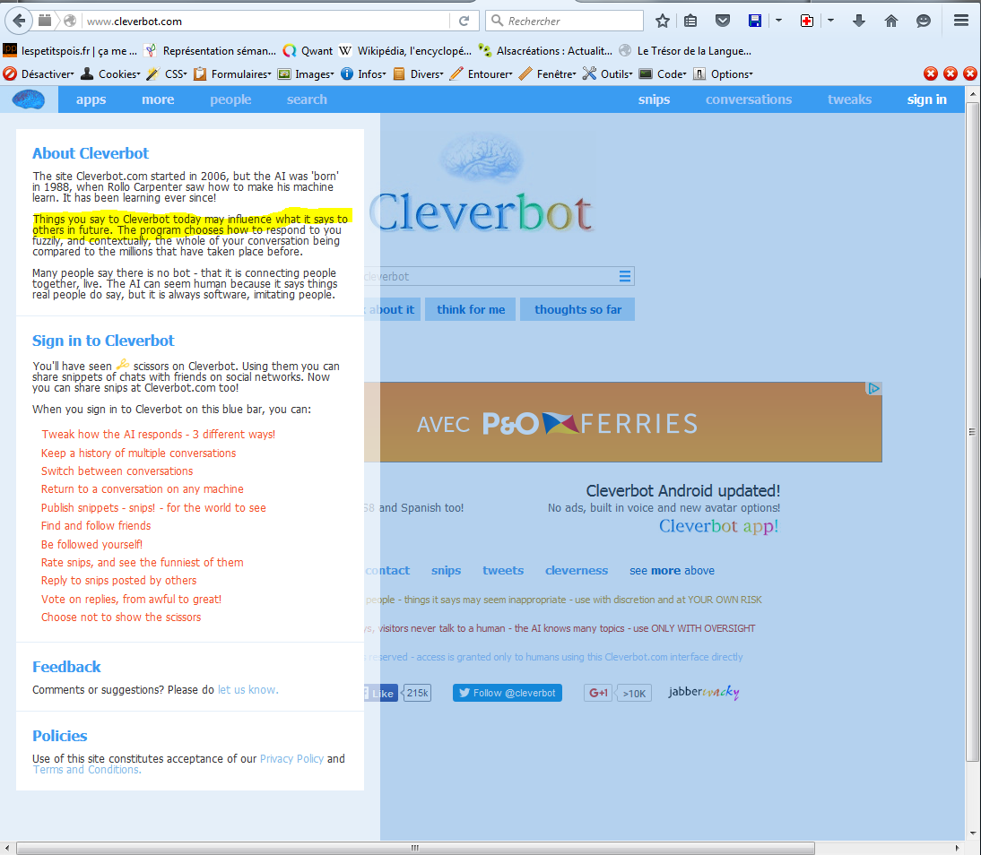 Ce soir j’ai discuté avec un robot, une “intelligence artificielle”: cleverbot.