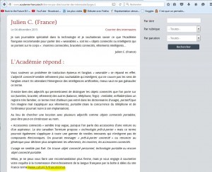 Ni une, ni deux, je me rends sur la site www.culture.fr/franceterme, et je cherche “wearable” dans leur moteur (la question du journaliste date de début décembre, il y a peut-être quelque chose…?).