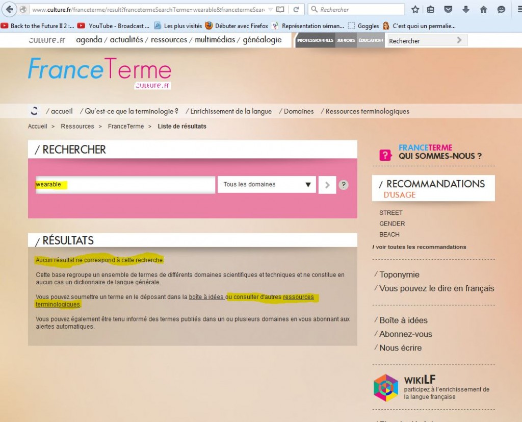 Non, aucun résultat pour “wearable”. Par contre on me propose de consulter “d’autres ressources terminologiques”, ce que je fais immédiatement: