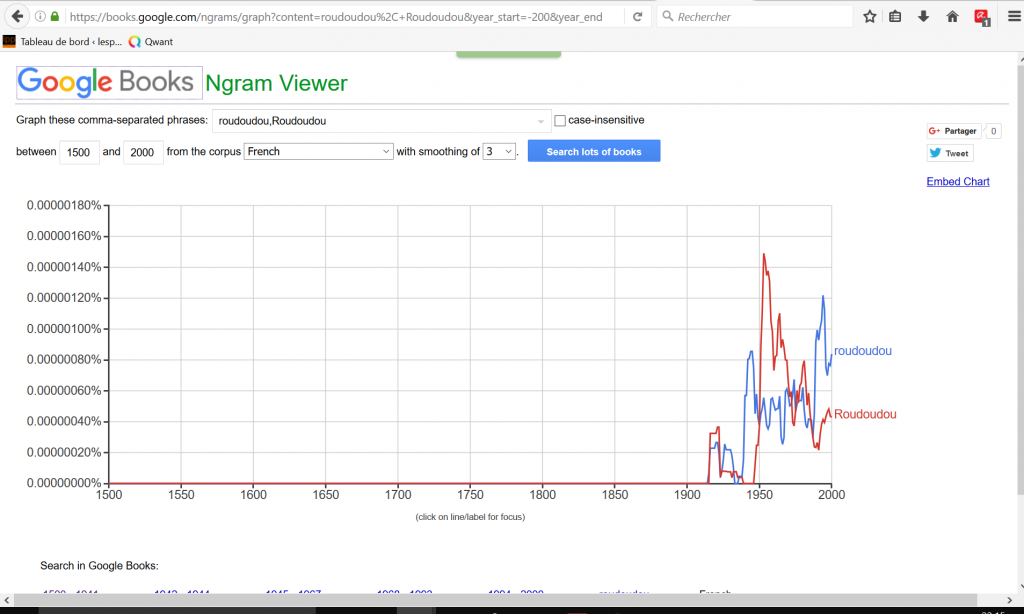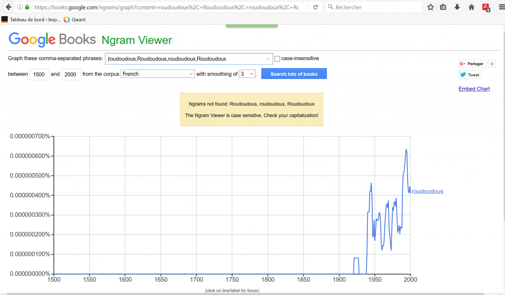 Ainsi, pour les mots “roudoudou” et “Roudoudou” Ngram Viewer me fabrique le diagramme suivant: