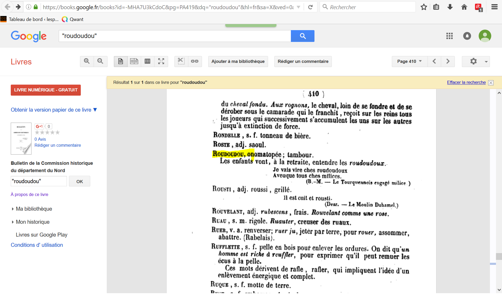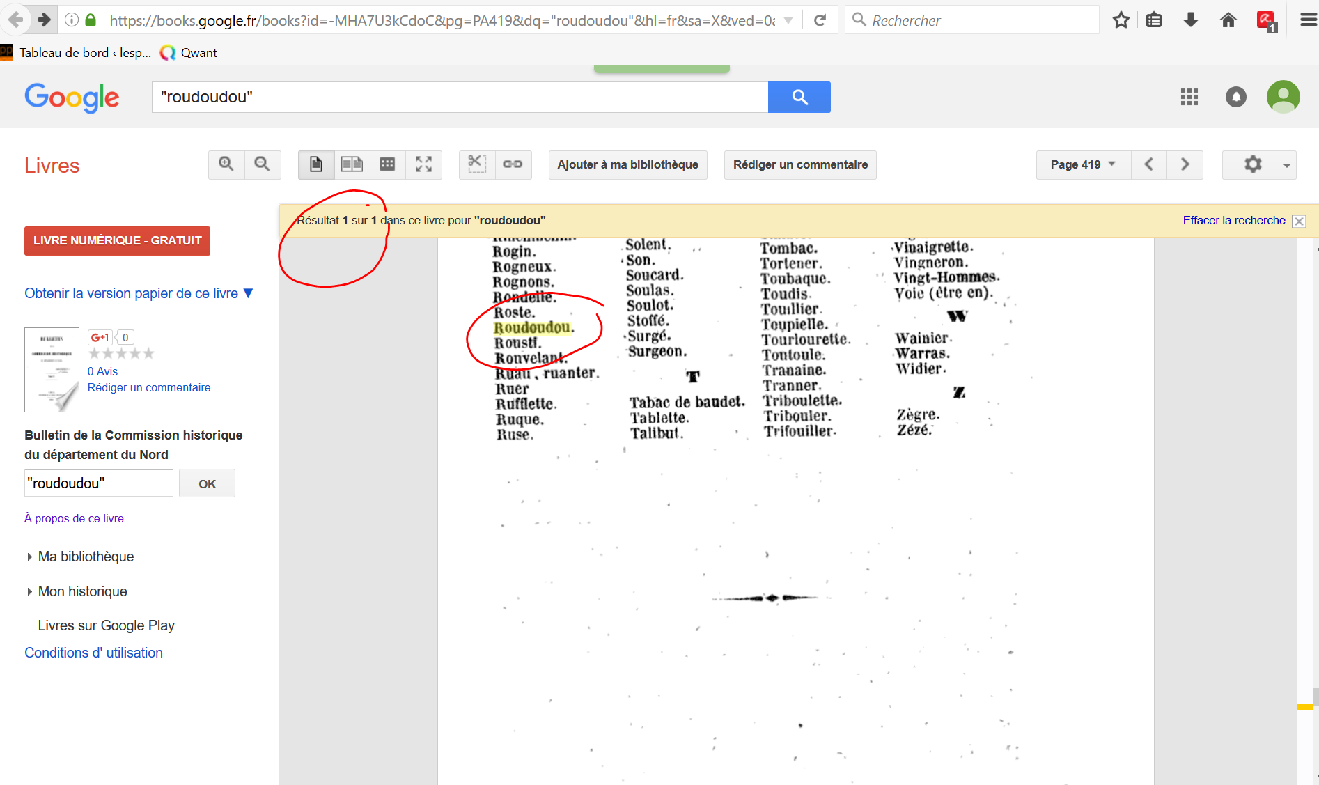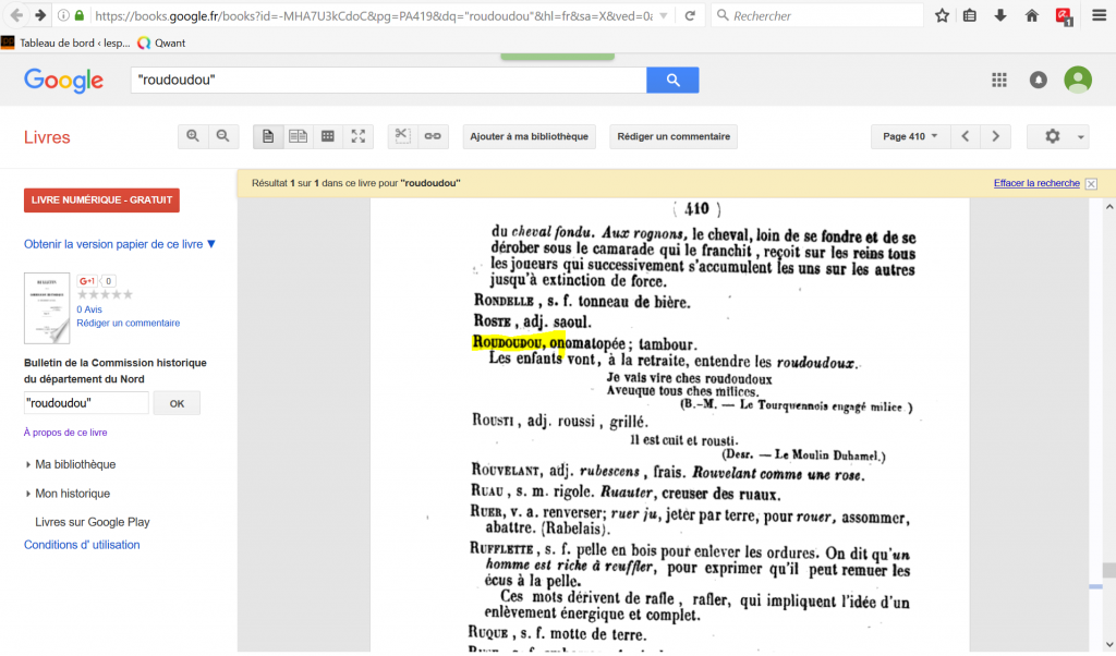 - le diagramme semble montré que le mot à surgit vers 1920 alors que des livres datant de la fin du 19ème siècle contiennent ce mot. C’est par exemple le cas dans un “Bulletin de la Commission historique du département du Nord” datant de 1851:
