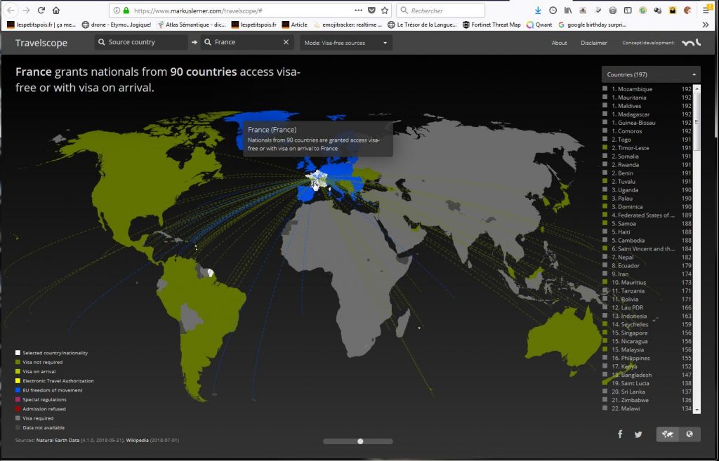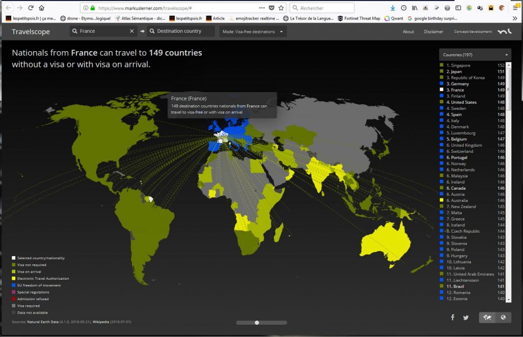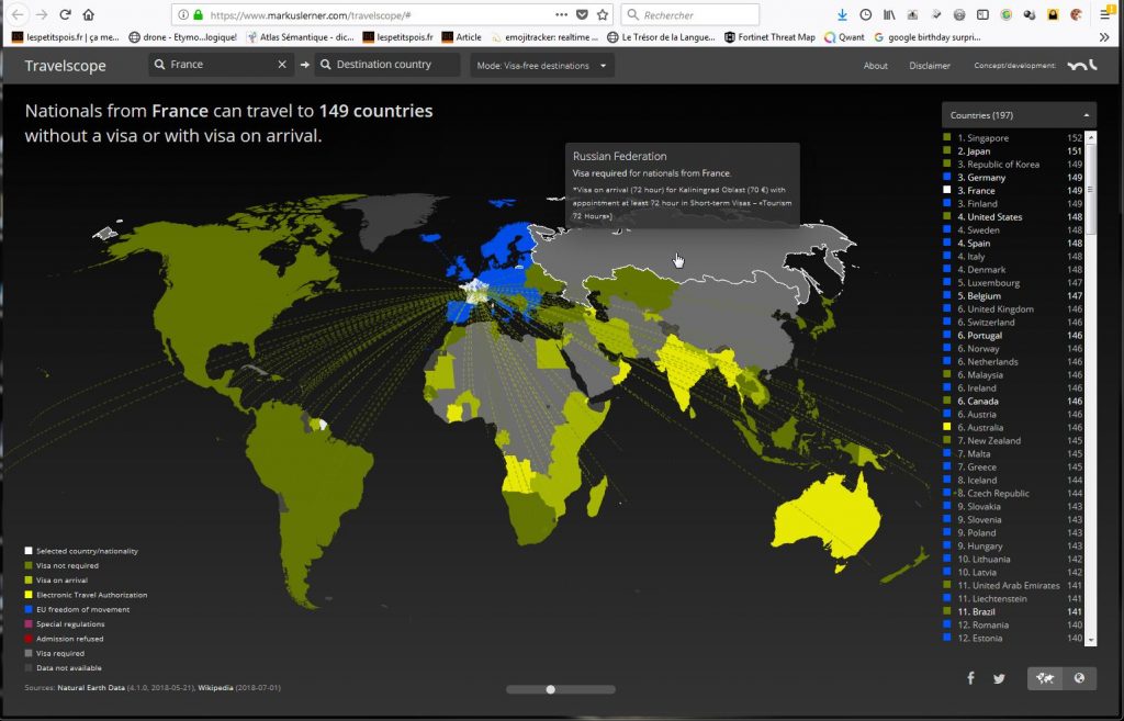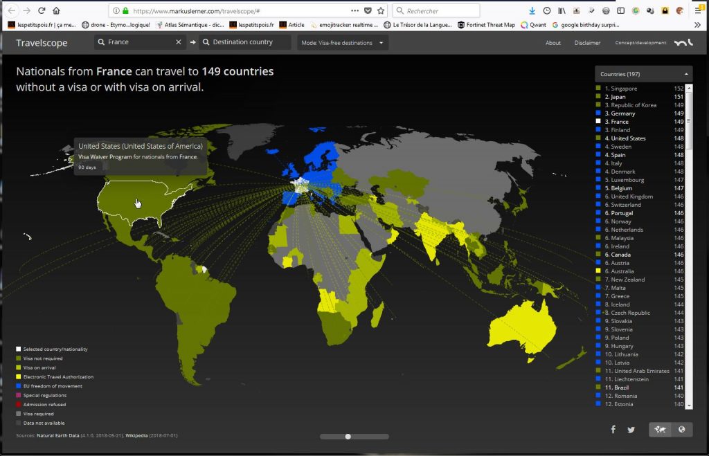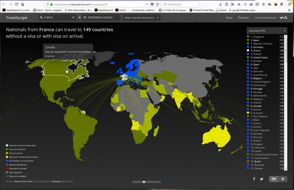 En voilà une qui permet de connaître les conditions d’entrée dans les pays: pas de visa, visa à l’arrivée, visa au départ. Utile pour les personnes qui n’ont pas encore choisi leur destination de vacances !