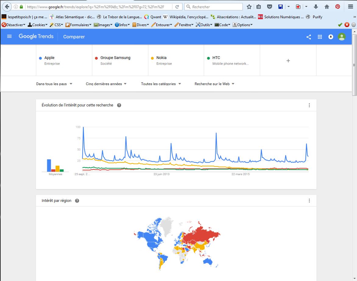 4 requêtes: ici, la tendance des marques de téléphones (en bleu, Apple; les pics: les différentes sorties de l’Iphone)