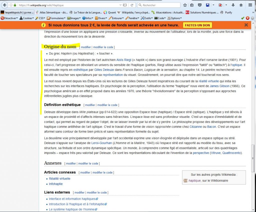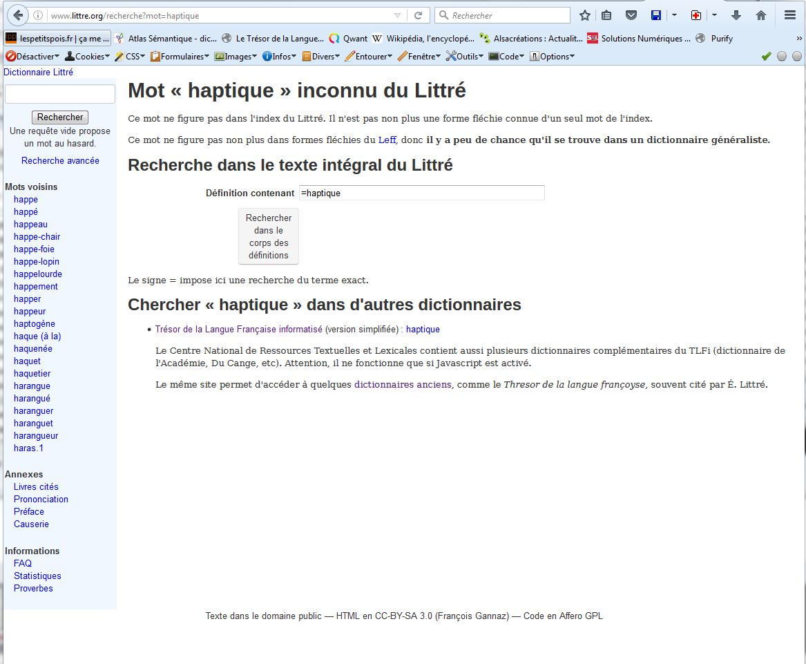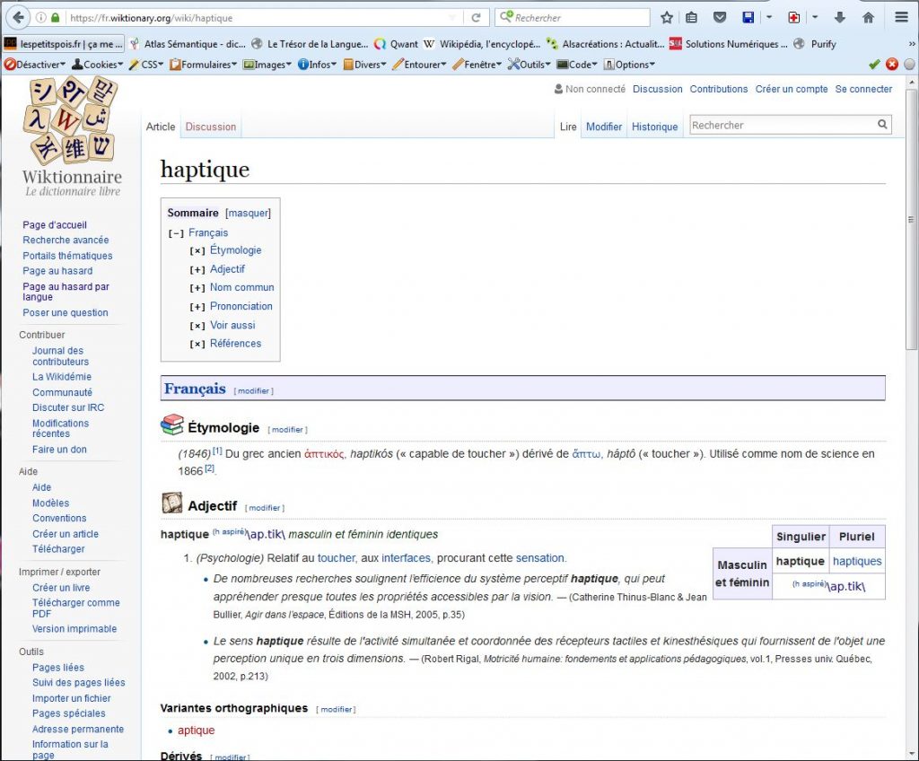 Joseph-Pierre Durand (de Gros), Essais de Physiologie philosophique, page 287, 1866, Germer Baillière. « Tels sont les principes si simples de la théorie du Toucher, que nous nommerons, par analogie de nomenclature, l’Haptique (ἄπτομαι, je touche), comme nous disons Optique et Acoustique. »