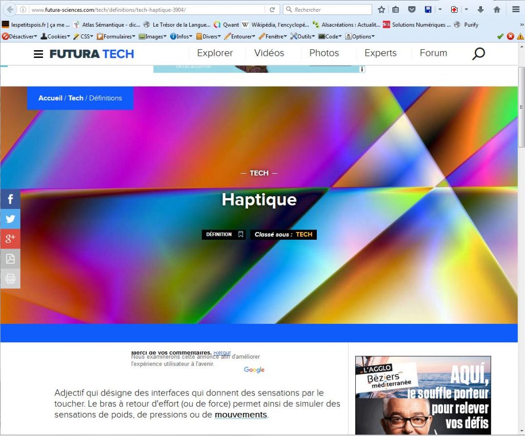 “Adjectif qui désigne des interfaces qui donnent des sensations par le toucher. Le bras à retour d’effort (ou de force) permet ainsi de simuler des sensations de poids, de pressions ou de mouvements.”