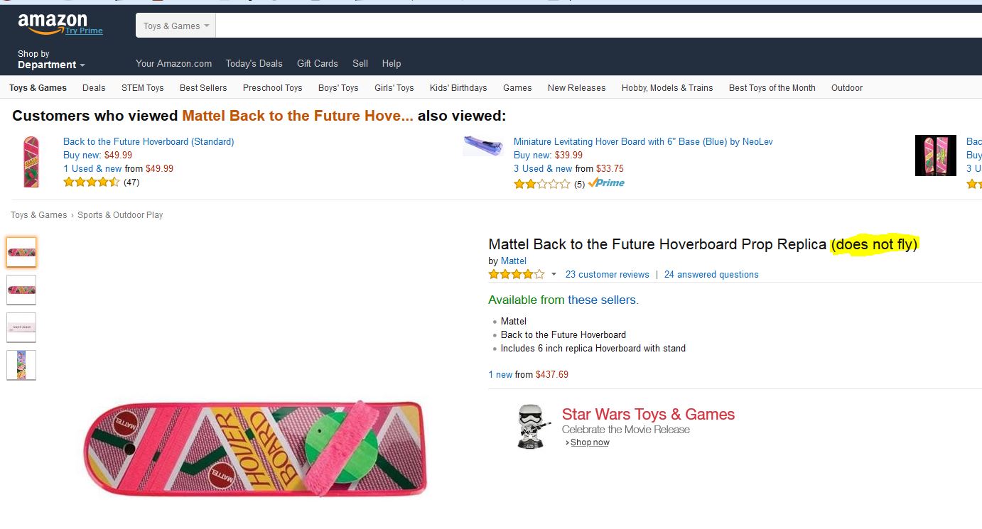 - Une réplique de l’Hoverboard par Mattel (mais qui ne vole pas) commercialisée en 2012