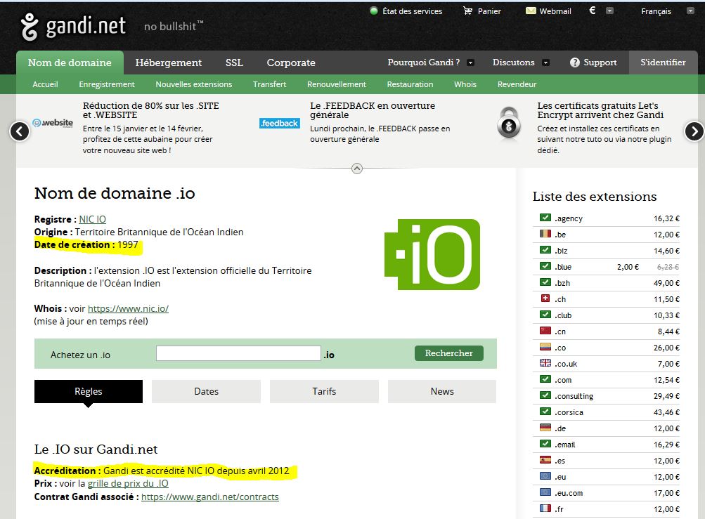 Bien. En fait il semble que j’ai pas mal d’années de retard: les noms de domaines en .io sont sur le marché depuis 2007 et l’accréditation de Gandi date quand même d’avril 2012…