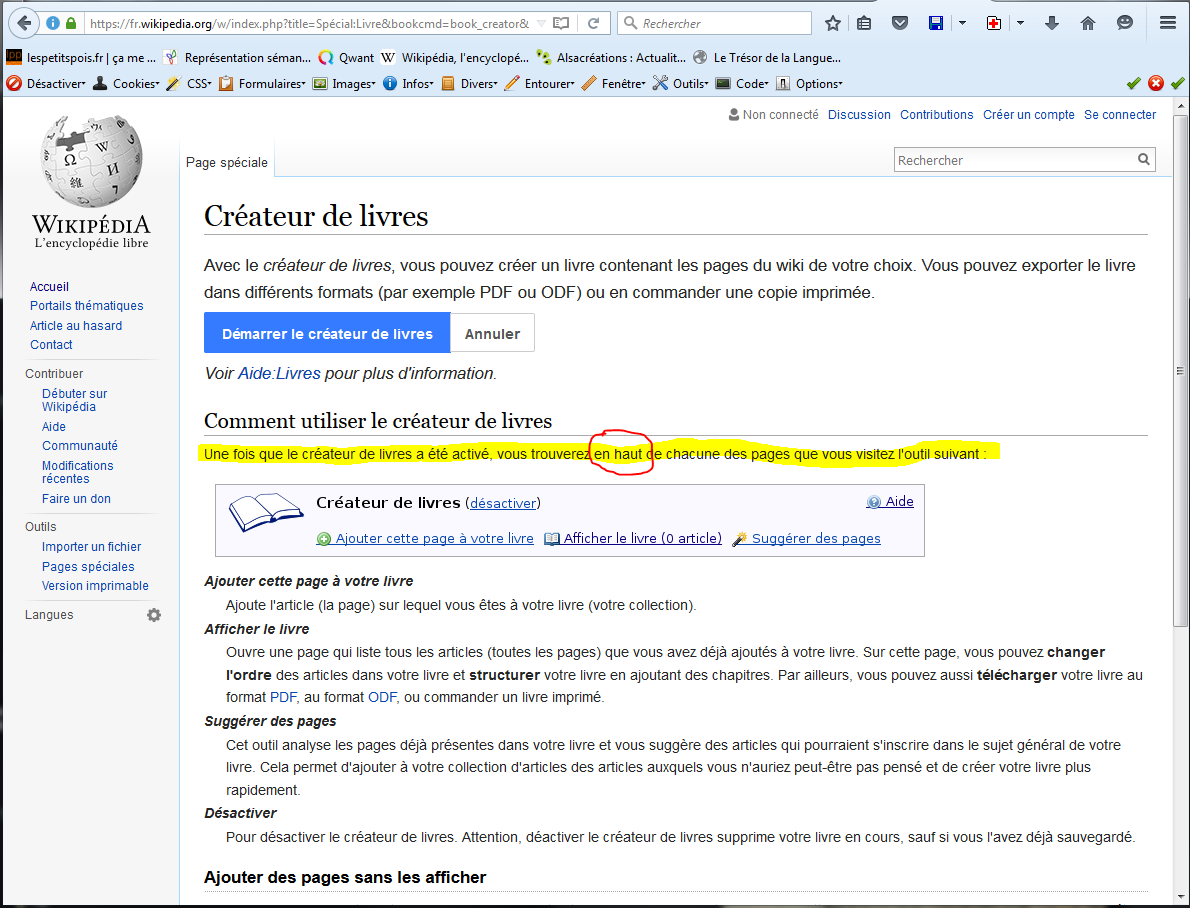 “Une fois que le créateur de livre a été activé vous trouverez en haut de chacune des pages que vous visitez l’outil suivant…”