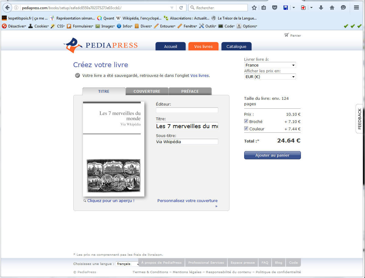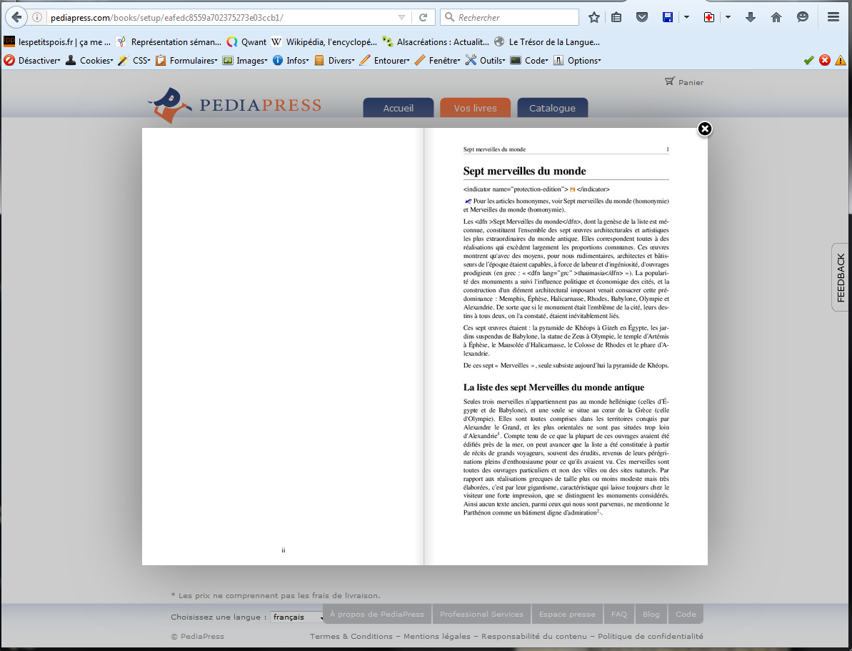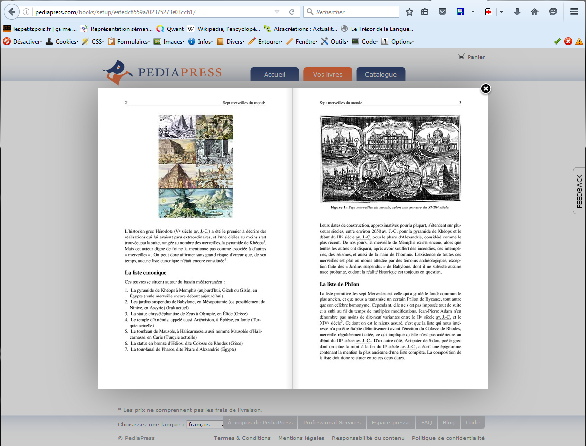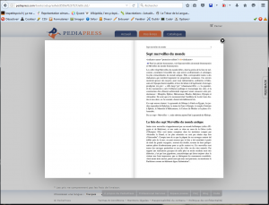 Un titre et un sous-titre plus tard, j’ai choisi de voir à quoi ça pouvait ressembler chez Pédiapress… ah oui, 8 articles mais 124 pages quand même ! C’est long un article Wikipédia en fait…