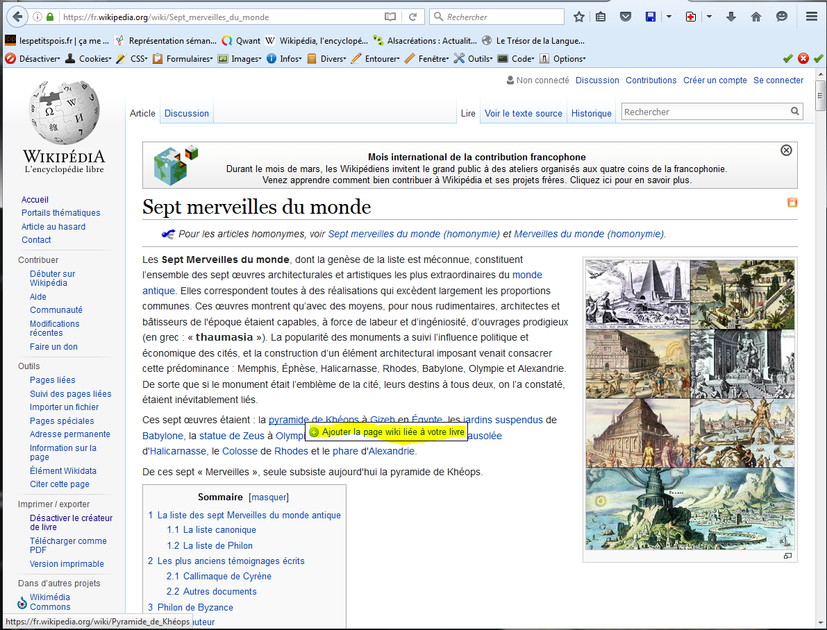 J’ai choisi un sujet qui me passionne: les 7 merveilles du monde; mais pas d’outil de création de livre en haut de page… ça commence mal…