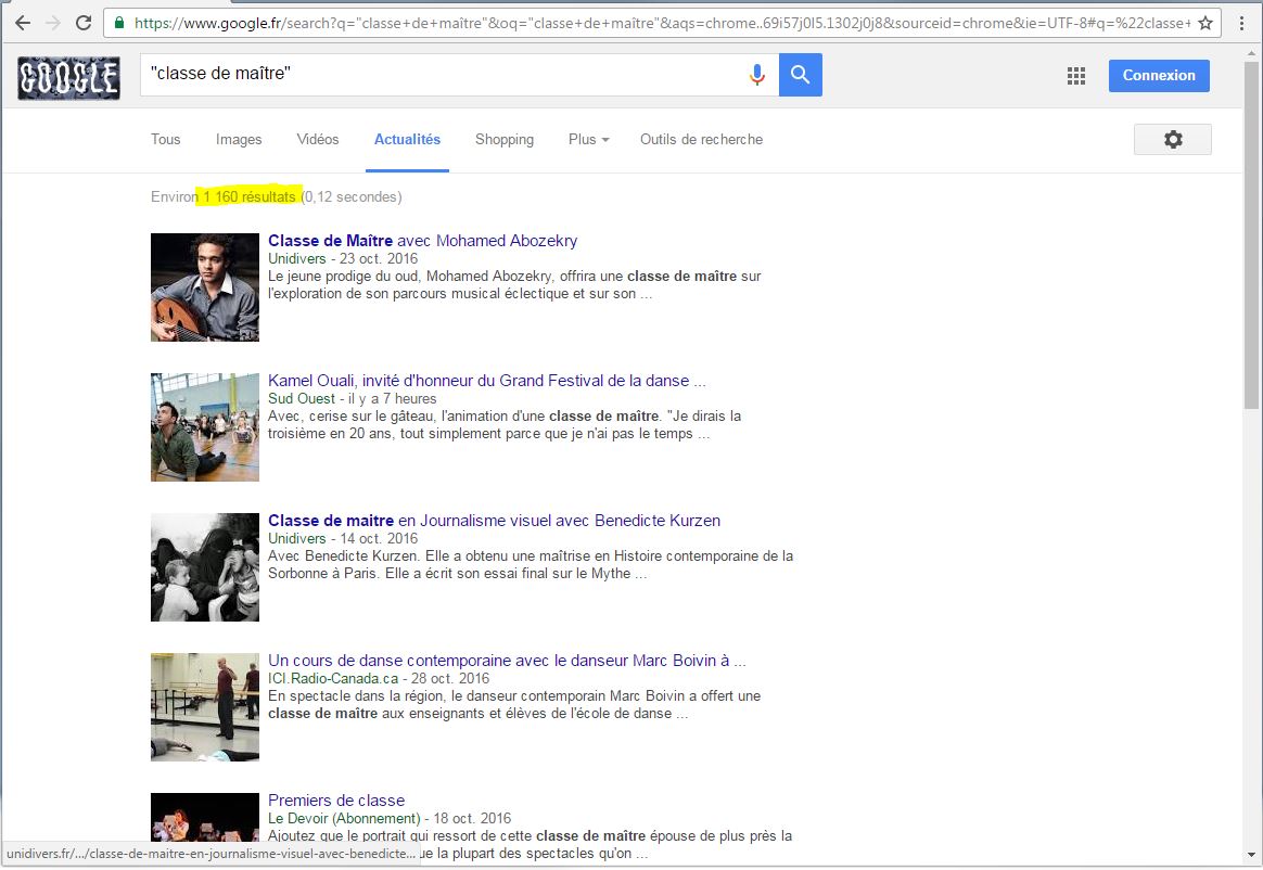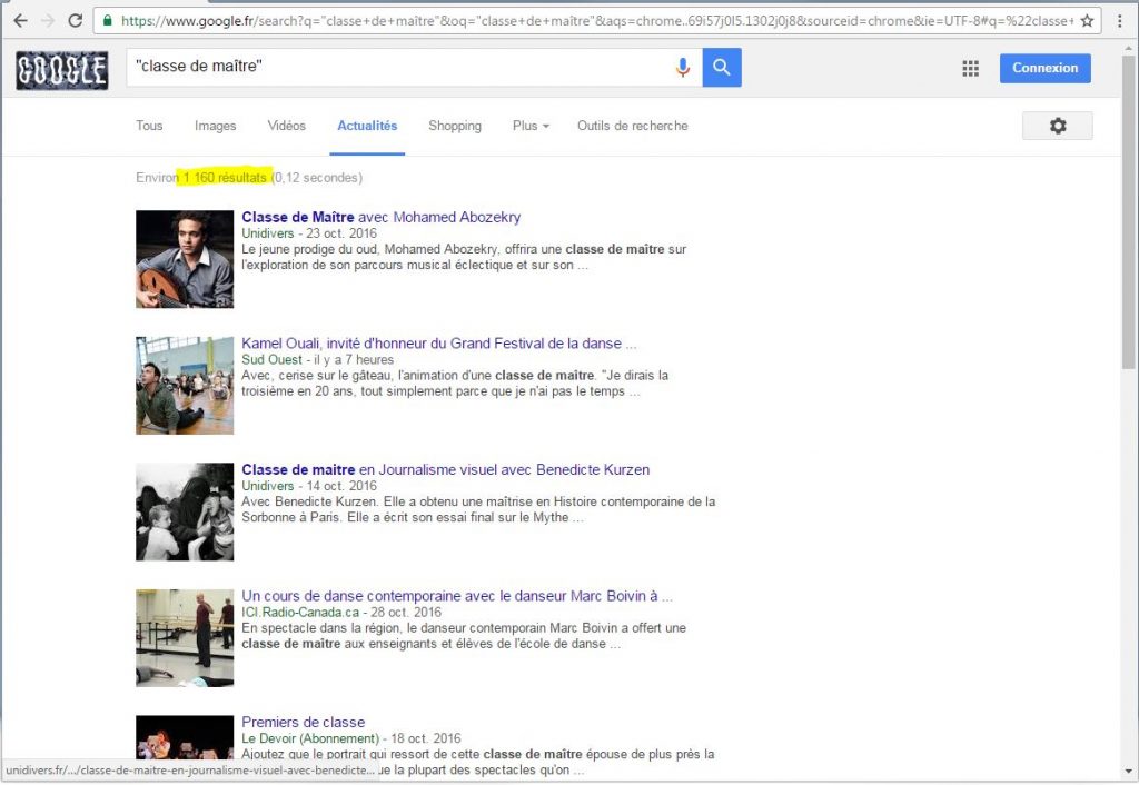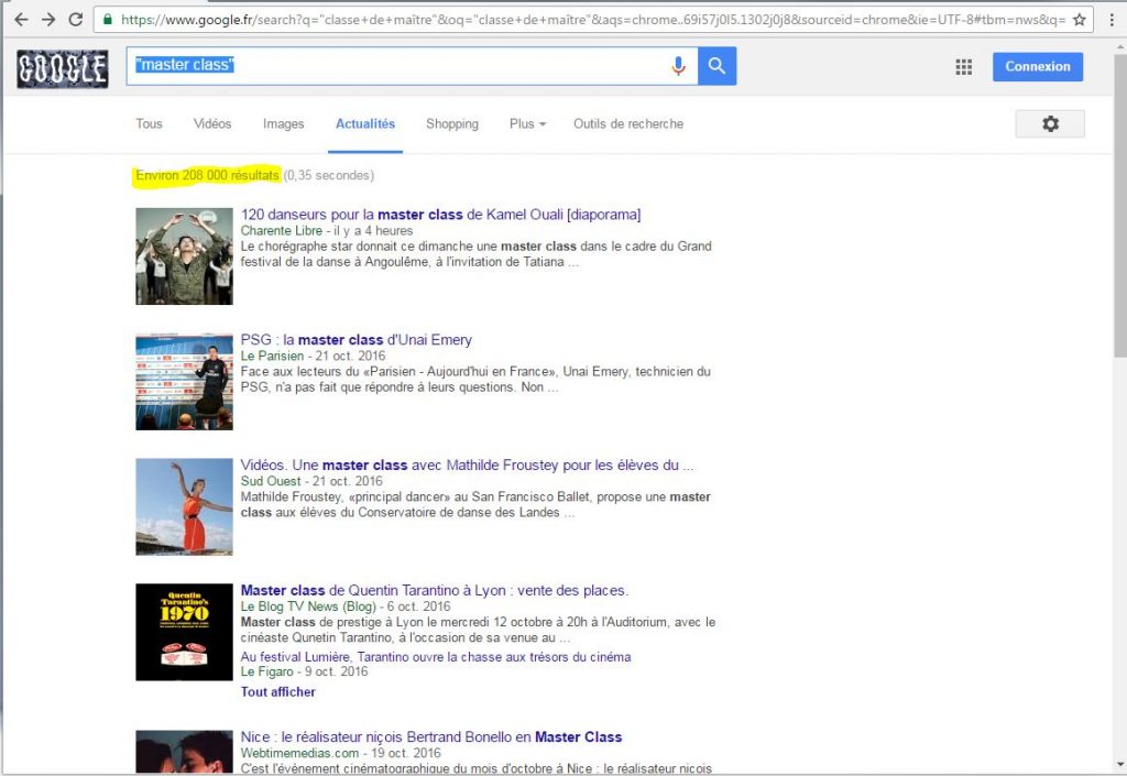 En effet si tu cherches “master class” dans l’actualité de Google et Google te trouve “environ 208 000 résultats”: