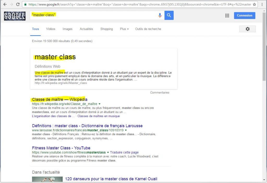 Alors oui, vous allez me dire que forcément, dans les résultats de la requête “master class” il n’y a pas que des articles en français alors que dans ceux de la requête “classe de maître”, si. Et vous n’aurez pas tort !