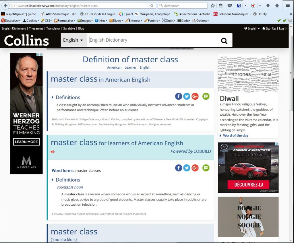 Quant à la définition même de “master class”, elle est devenue subsidiaire dans ce contexte, mais si jamais ça vous titille, la meilleure que j’ai trouvé est dans le Collins qui offre une définition un peu revisitée afin d’être plus actuelle (la deuxième):