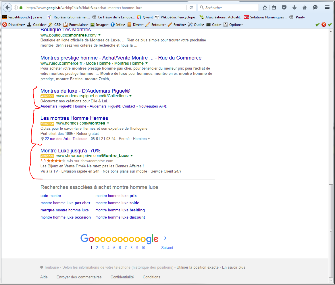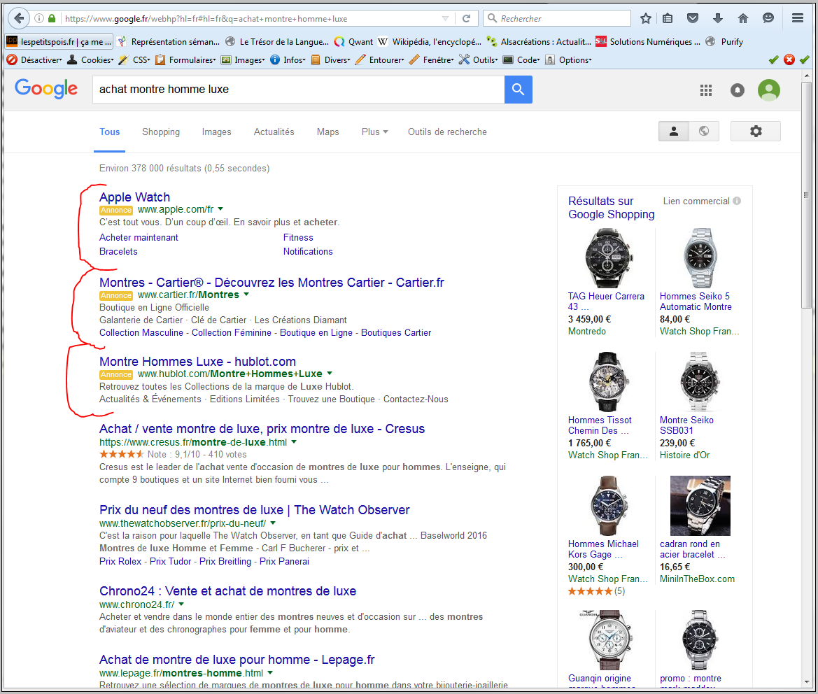 J’ai pensé à la même chose. Du coup j’ai décidé “d’évangéliser”. A ma manière. Et donc, chers internautes pour ce faire, je vous ai fait de magnifiques screenshots sur lesquels j’ai mis en évidence au styet rouge les vilaines publicités de Google:
