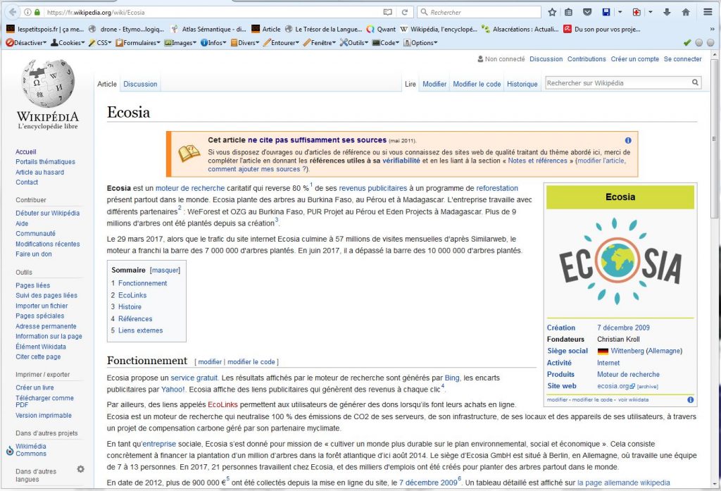 Et bien voilà une idée simple pour une petite contribution: si tu ne te sens lié ni par Google (j’espère…), ni par Qwant (même si…), ni par etc. , je te propose de faire un tour sur ecosia.org pour tes futures recherches: