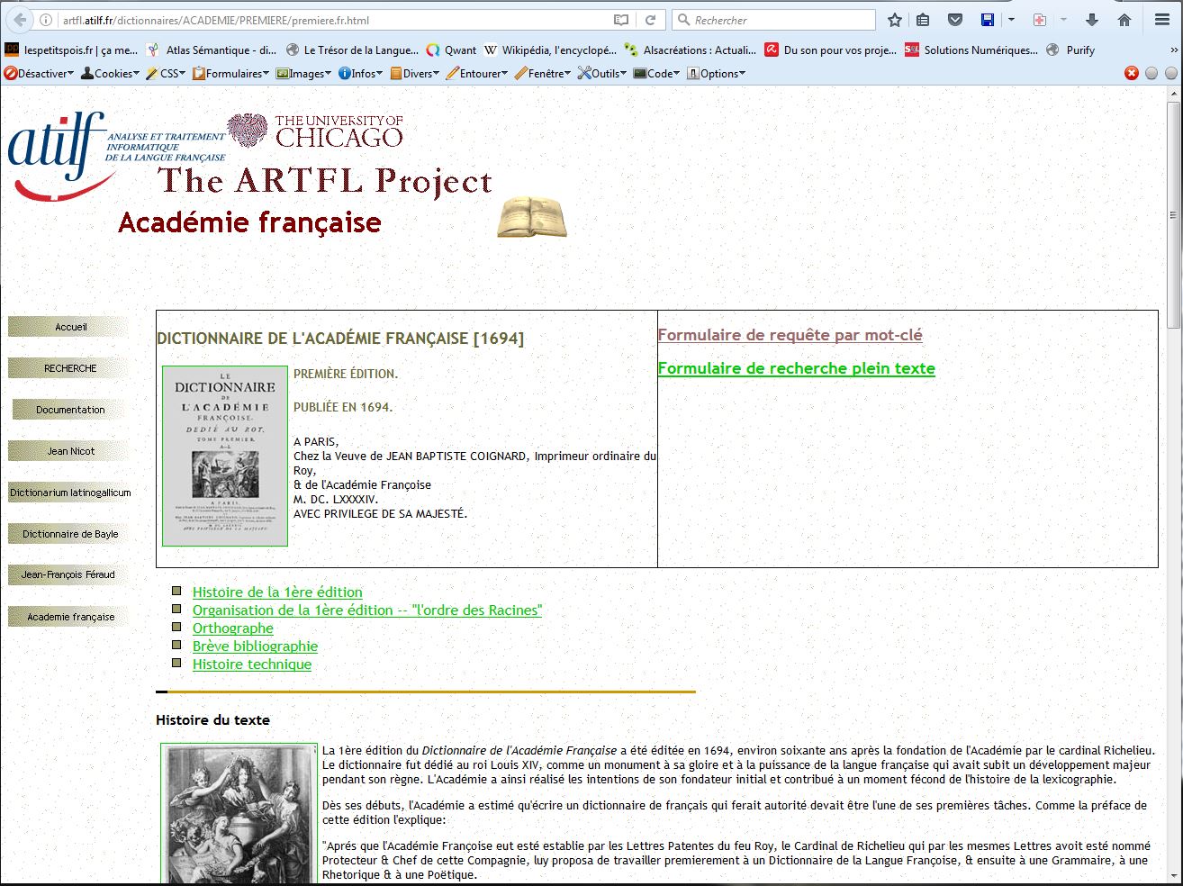 Le CNRTL en partenariat avec l’Université de Chicago via le “ARTFL Project” a informatisé quelques éditions du dictionnaire de l’Académie. Ainsi, sur chaque mot recherché, on peut naviguer de dictionnaire en dictionnaire pour découvrir les définitions qui en ont été données selon les époques: