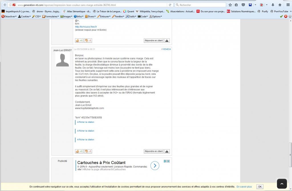 « en laser ou photocopieur, il n’existe aucun système sans marge. Cela est inhérent au procédé. Bien que le [fil] corona fasse toute la largeur de la feuille, la charge électrostatique diminue à proximité des bords de la dite feuille. De ce fait, l’encrage est moins bon (la poudre ne tient pas bien).