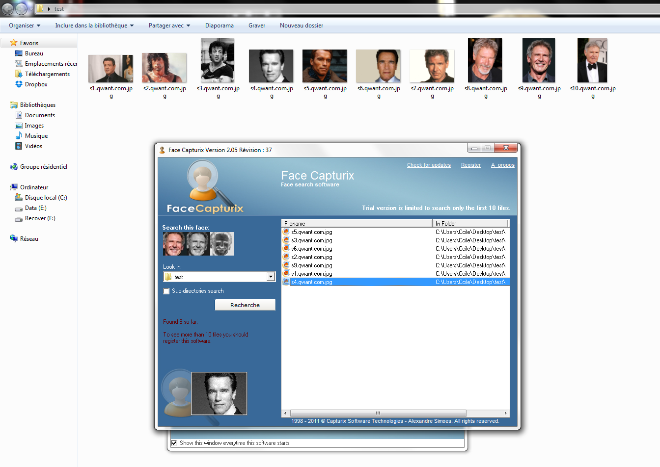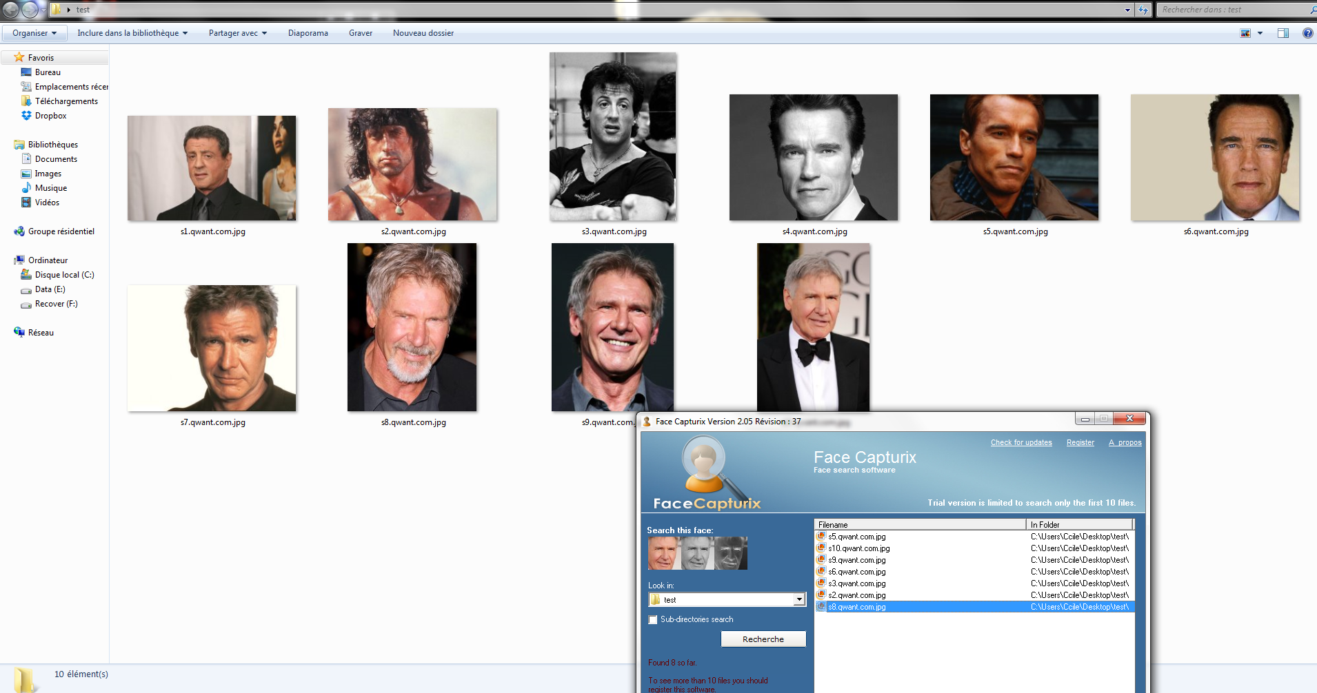Mon test comprend 10 photos de Stalone, Sharzy et Harison Ford… je lui demande de me retrouver toutes les photos de Harison Ford et il me retourne n’importe quoi (cf les noms des photos dans les screenshots).