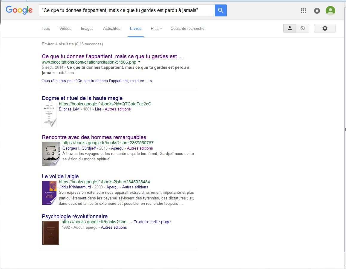 Ensuite, Google Livre me renvoie aussi vers 4 livres… J’élimine d’office les 3 dont je n’ai jamais entendu parlé pendant ce marathon et je garde donc “Rencontre avec des hommes remarquables” Georges Ivanovitch Gurdjieff.