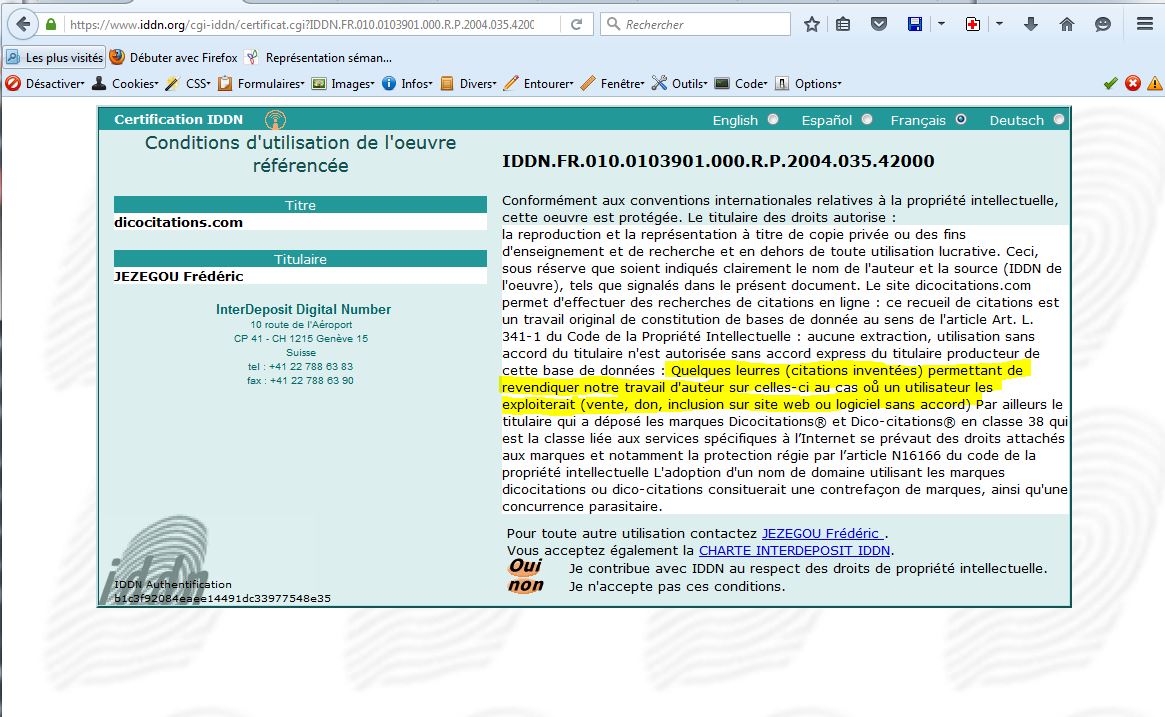 “Quelques leurres (citations inventées) permettant de revendiquer notre travail d’auteur sur celles-ci au cas oů un utilisateur les exploiterait (vente, don, inclusion sur site web ou logiciel sans accord)”