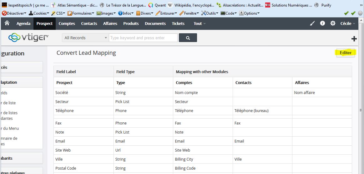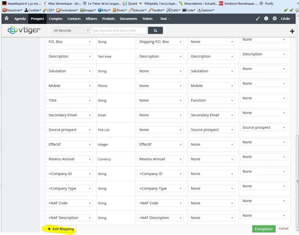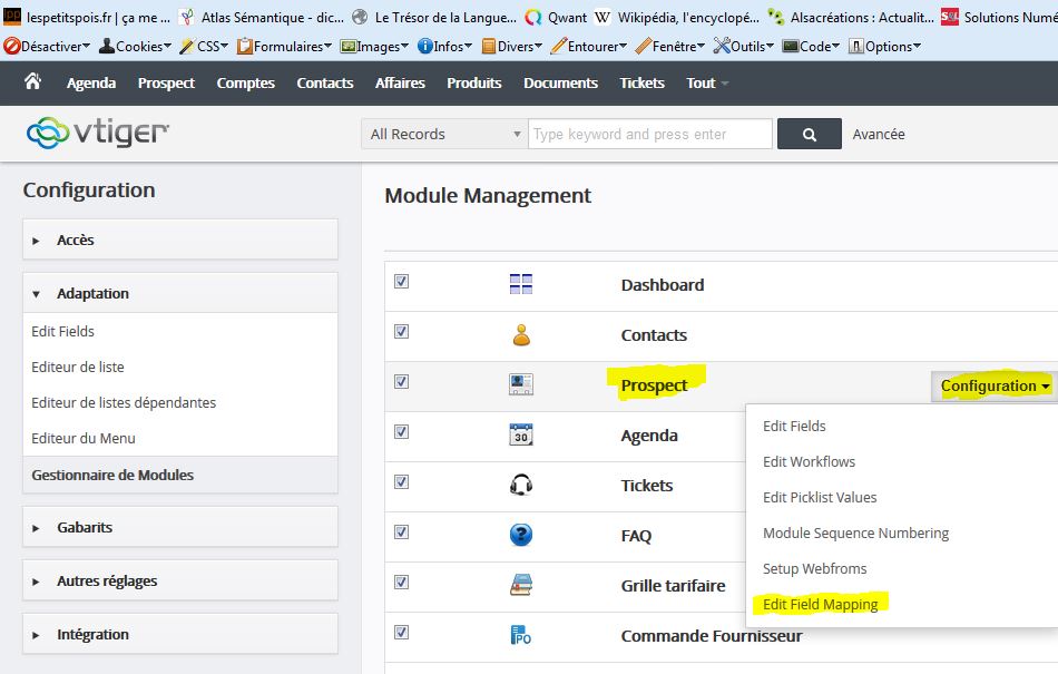 Effectivement, il ne suffit pas d’avoir ajouté des champs (customs fields) dans la fiche “prospect” et les mêmes dans la fiche “société” pour que la conversion fonctionne par la suite. Il faut dire au logiciel quels champs de la fiche “prospect” vont remplir quel champ de la fiche “société”. C’est ce qu’on appelle le mapping.