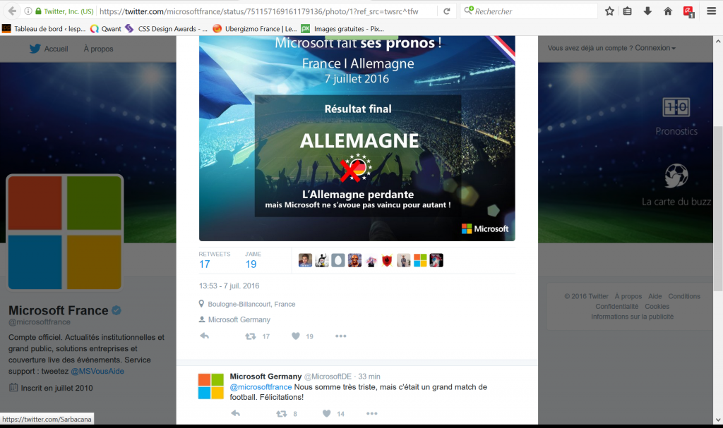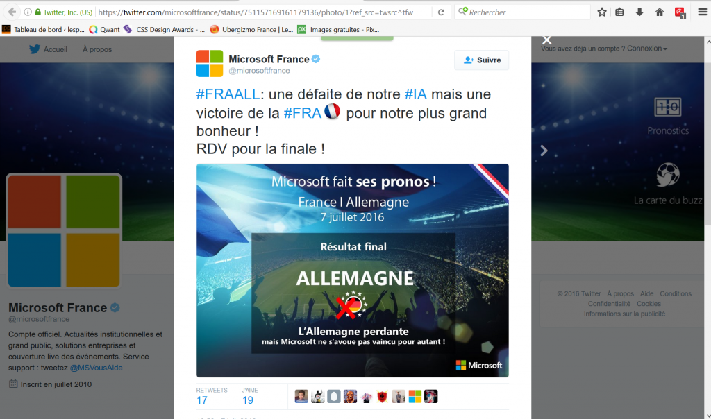 Ce soir à 20H30 sur la page des pronostics de Bing à propos de l’Euro: