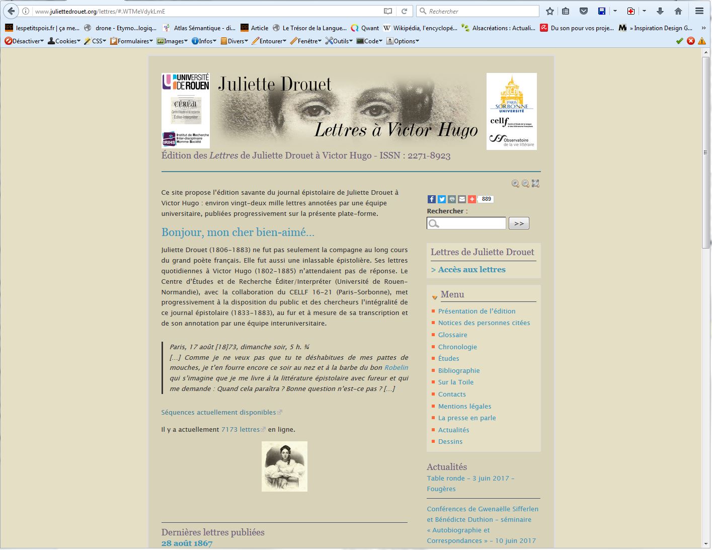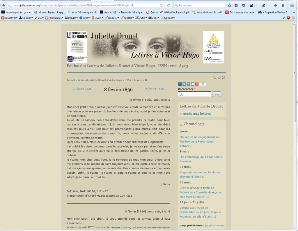 propose l’édition savante du journal épistolaire de Juliette Drouet à Victor Hugo : environ vingt-deux mille lettres annotées par une équipe universitaire, publiées progressivement sur la présente plate-forme.