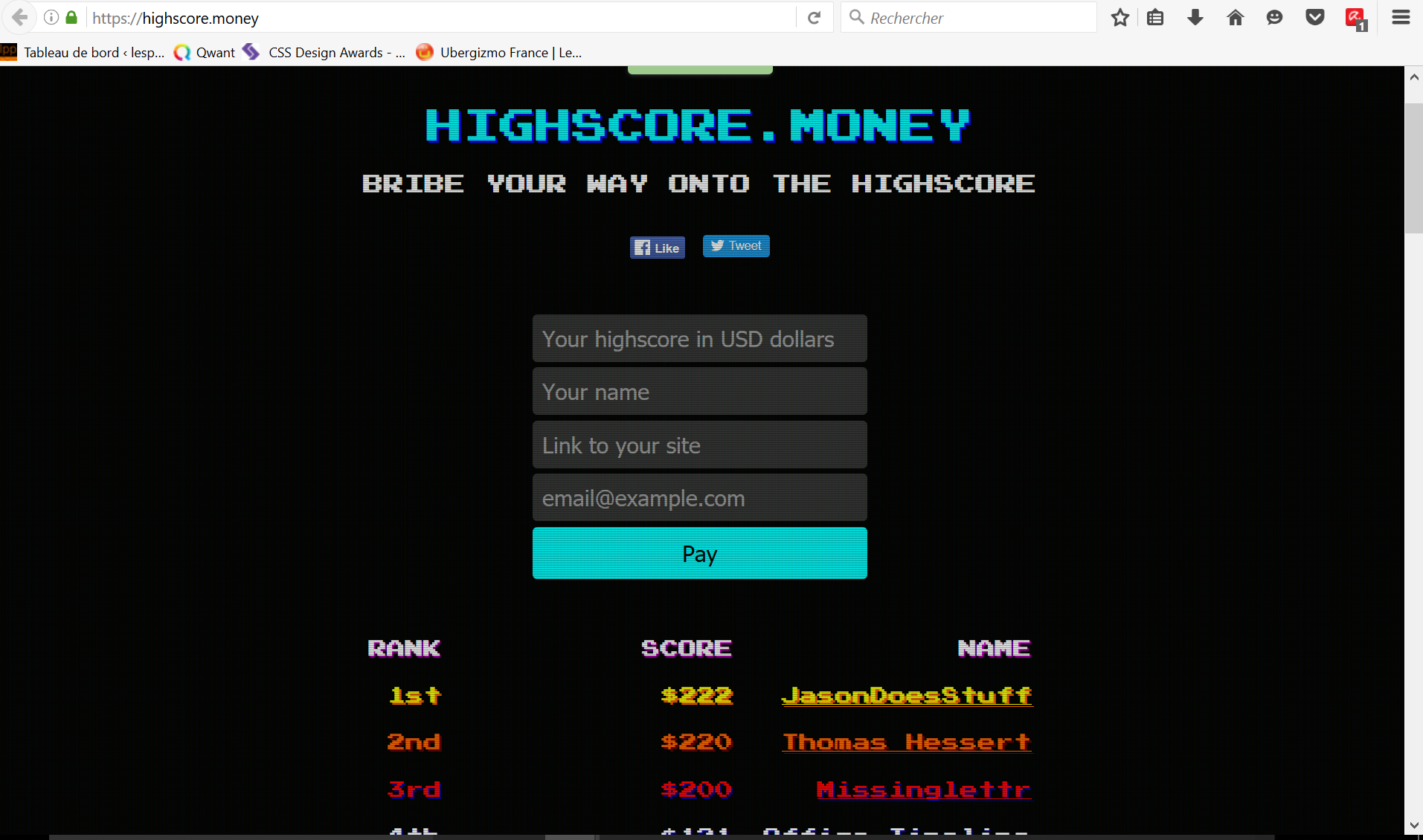 Marc a tout simplement mis en ligne un site qui peut s’occuper de tout ces malheureux: il leur propose juste de payer pour apparaître sur son site. Et plus ils payent, et plus ils ont un score haut (leur montant, c’est leur score) . Et ainsi tous ces gens peuvent être de nouveau heureux puisqu’ils apparaissent dans un hightscore !