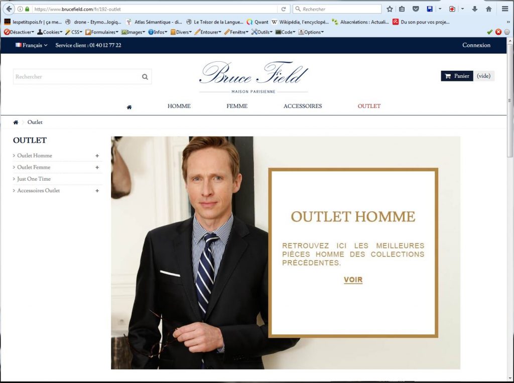 B/ Outlet = magasin d’usine chez Bruce Field. Les mots employés sont bien différents. On ne met pas l’accent sur le prix “pas cher” mais sur l’ancienneté des collections: