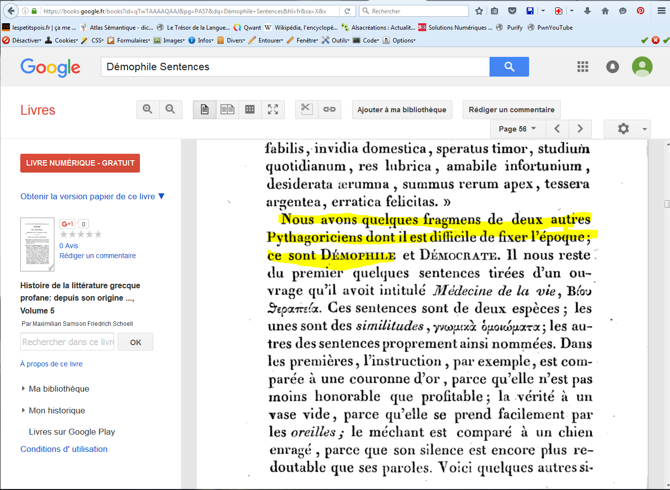 Sur les Sentences de Démophile Pytagoricien: Histoire de la littérature grecque profane: depuis son origine …, Volume 5 Par Maximilian Samson Friedrich Schoell