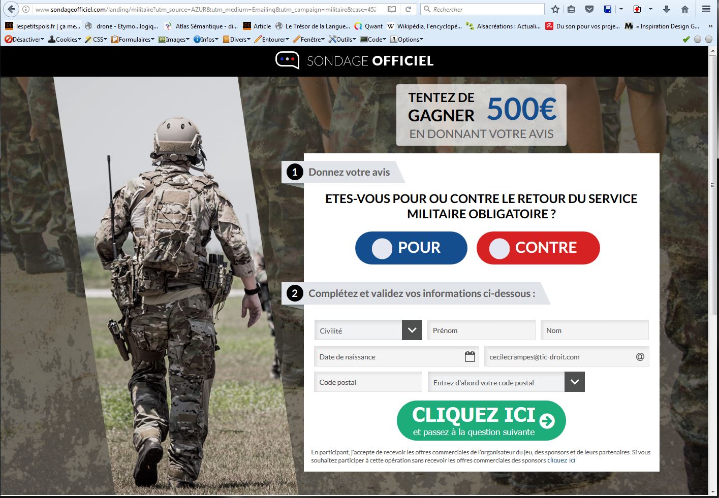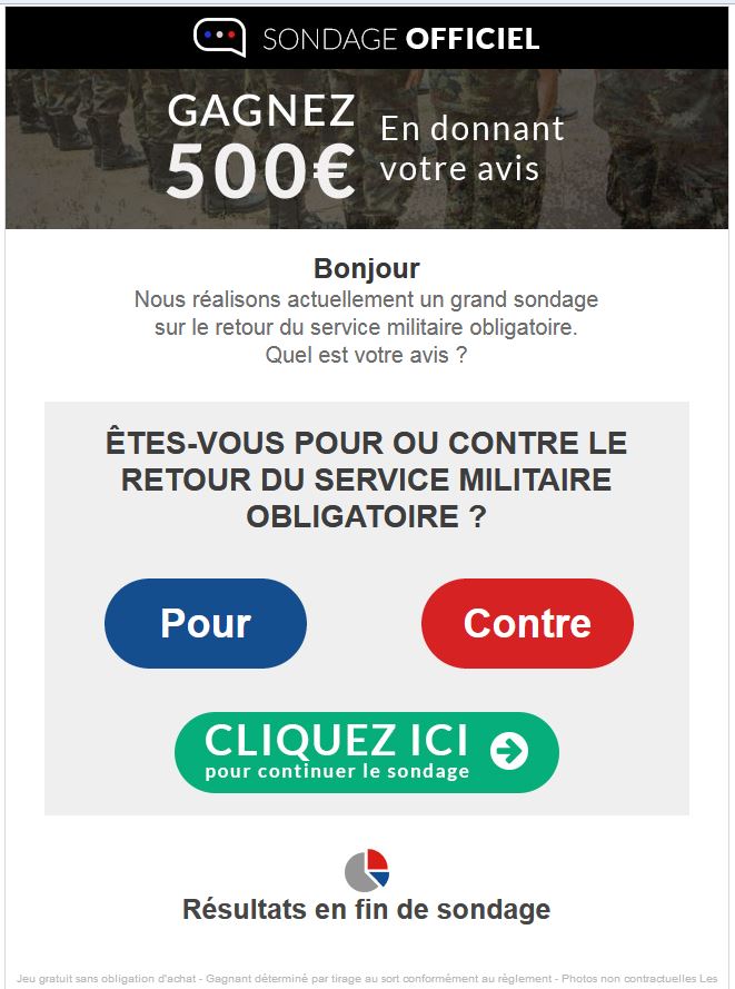 Quand tu reçois dans ta boîte aux lettres la newsletter suivante ayant pour sujet “Êtes-vous pour ou contre le retour du service militaire obligatoire ?”: